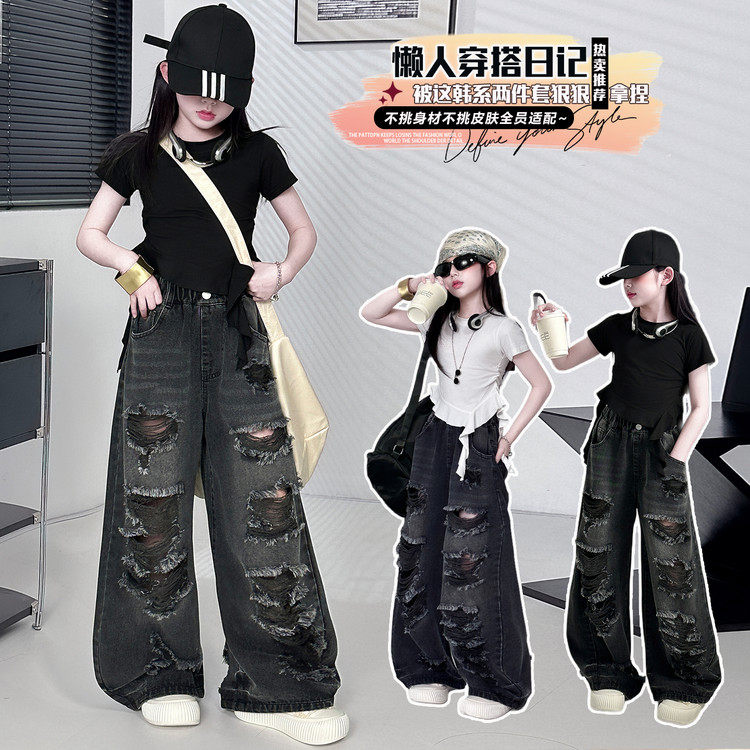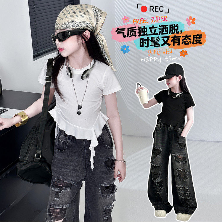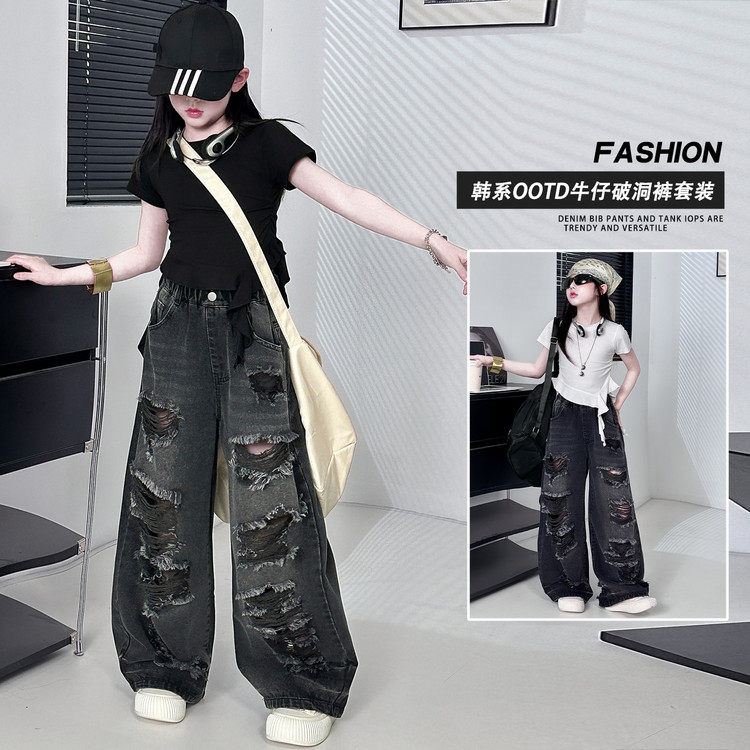 女童夏季穿搭潮酷短袖T恤套装女大童夏装宽松破洞牛仔裤两件套