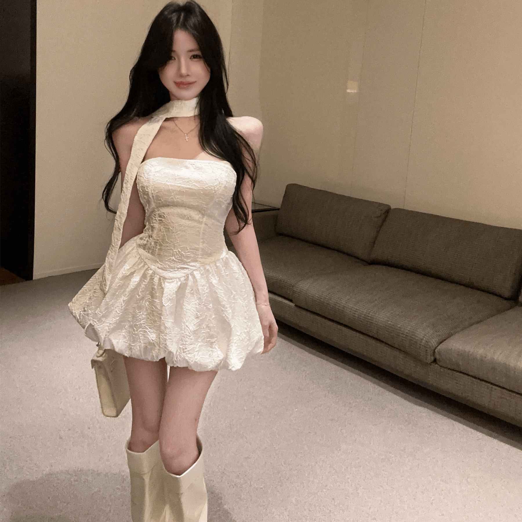 千金名媛小香风吊带连衣裙女秋冬法式公主花苞蓬蓬裙挂脖抹胸裙子