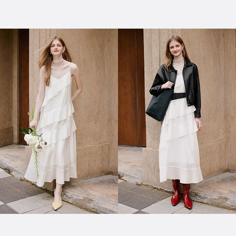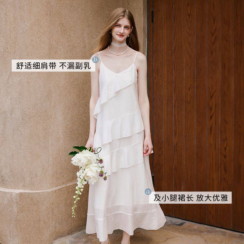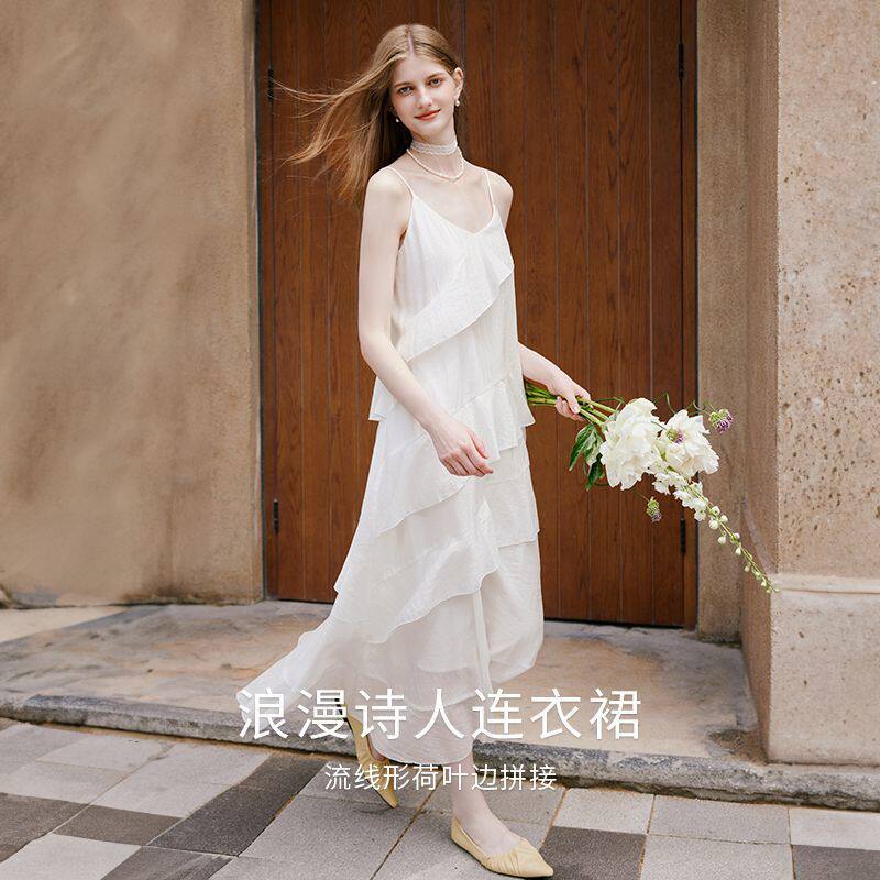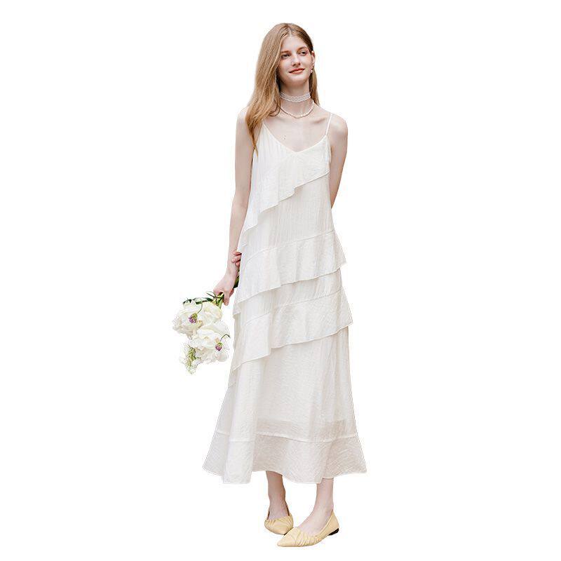 2026春夏新款度假法式v领大码雪纺吊带连衣裙女白色长款蛋糕裙子