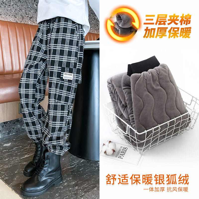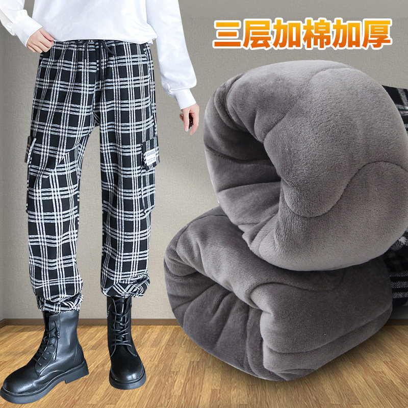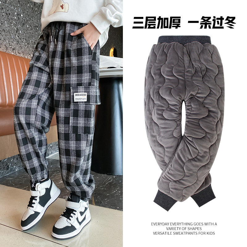 女童裤子加棉三层加厚中大儿童格子秋冬款休闲百搭外穿加绒棉裤子