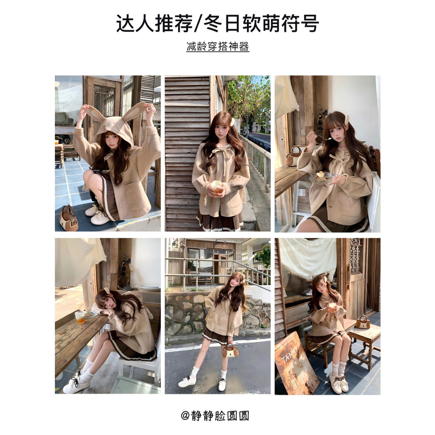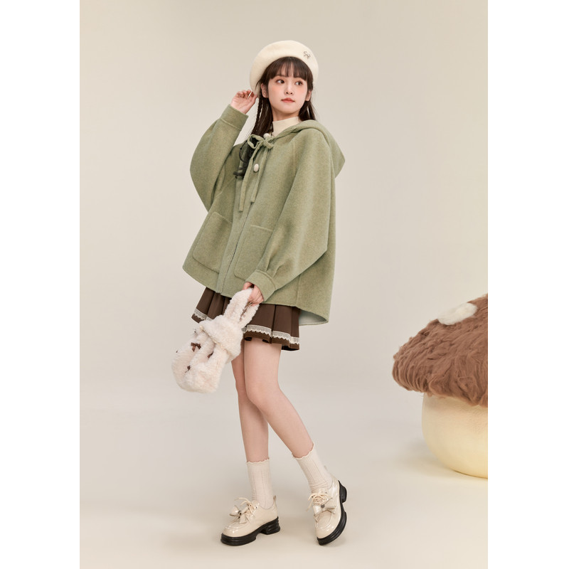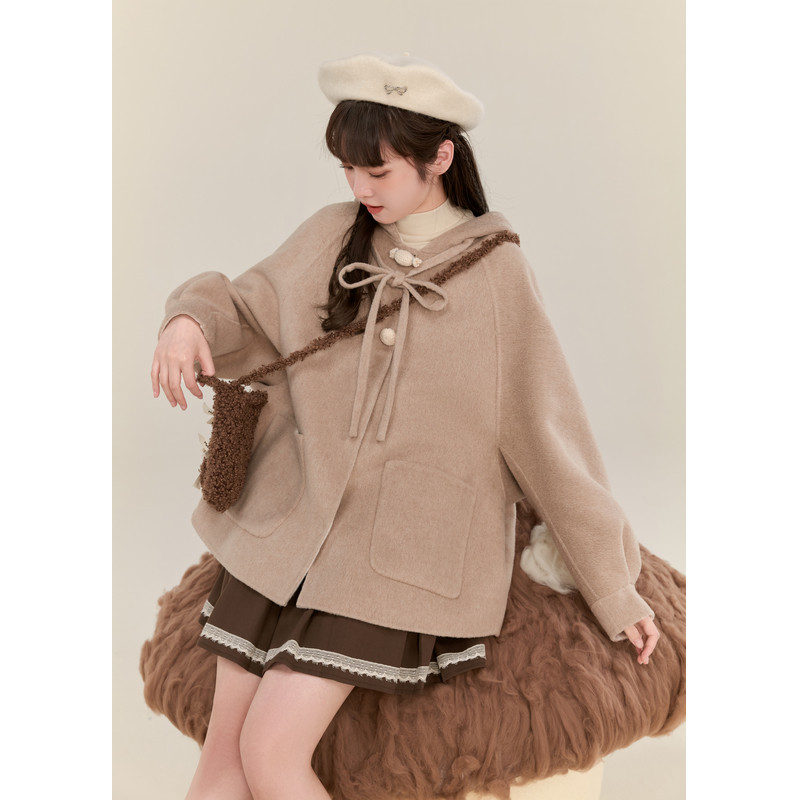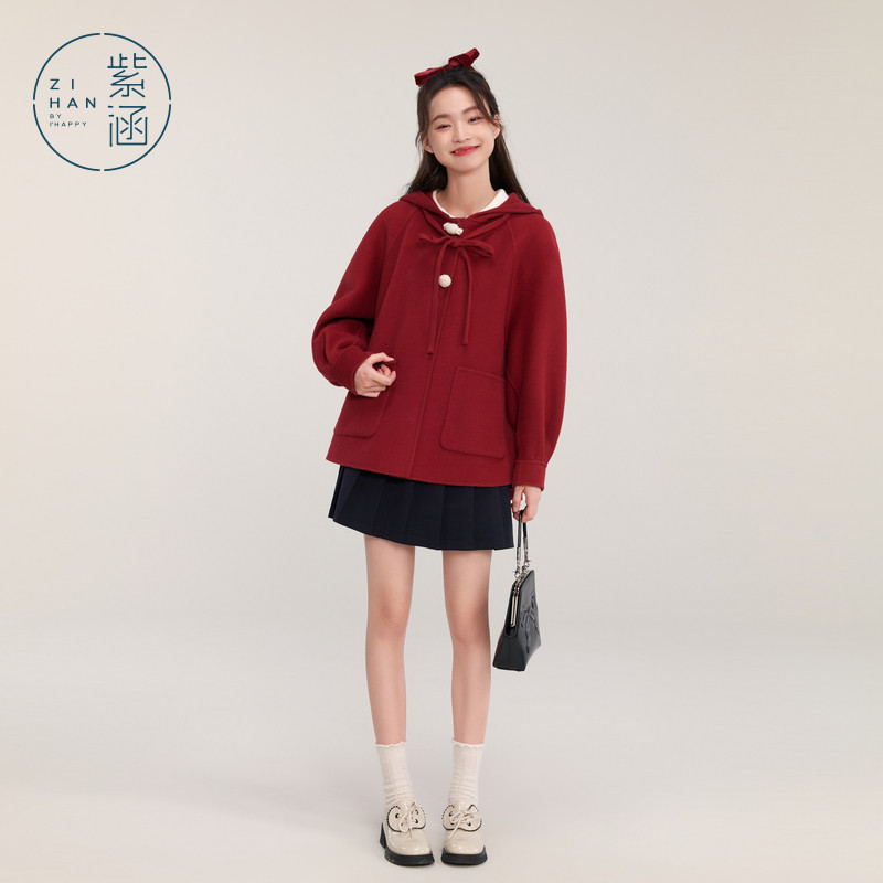 紫涵红色短款连帽双面羊毛呢大衣女冬季新款兔耳朵设计感休闲外套