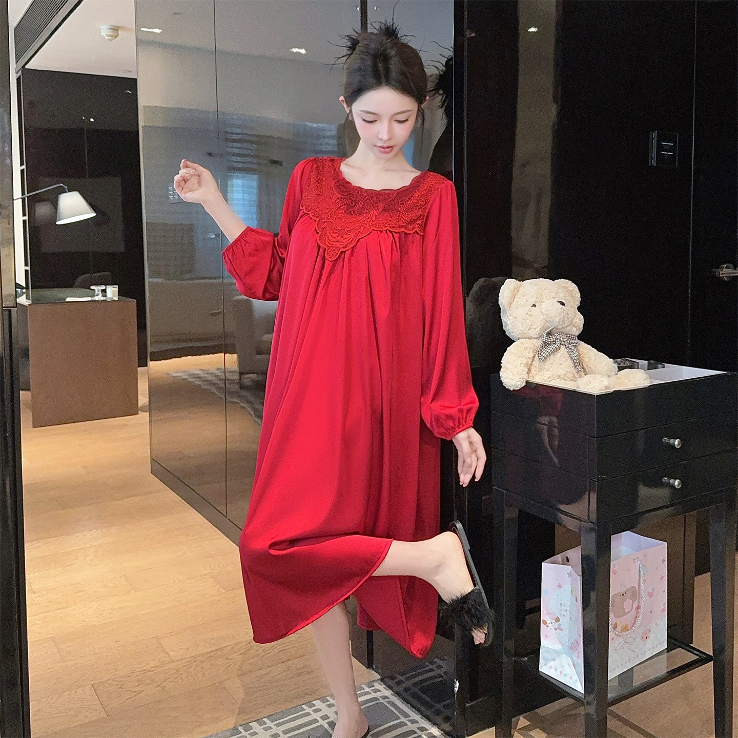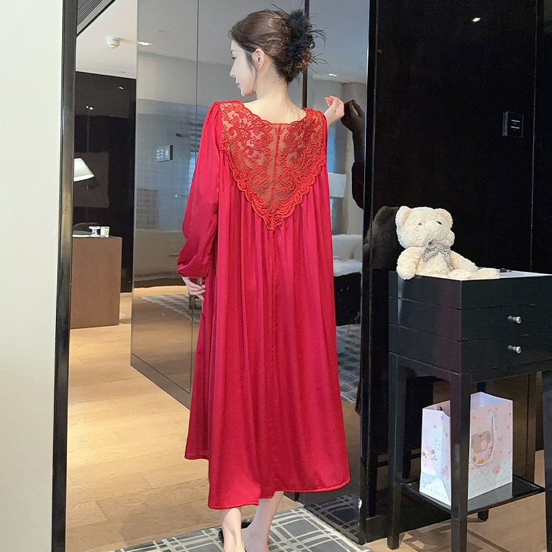 蕾丝美背睡裙加长款冰丝绸红色睡衣女性感大码连衣裙带胸垫长袖裙
