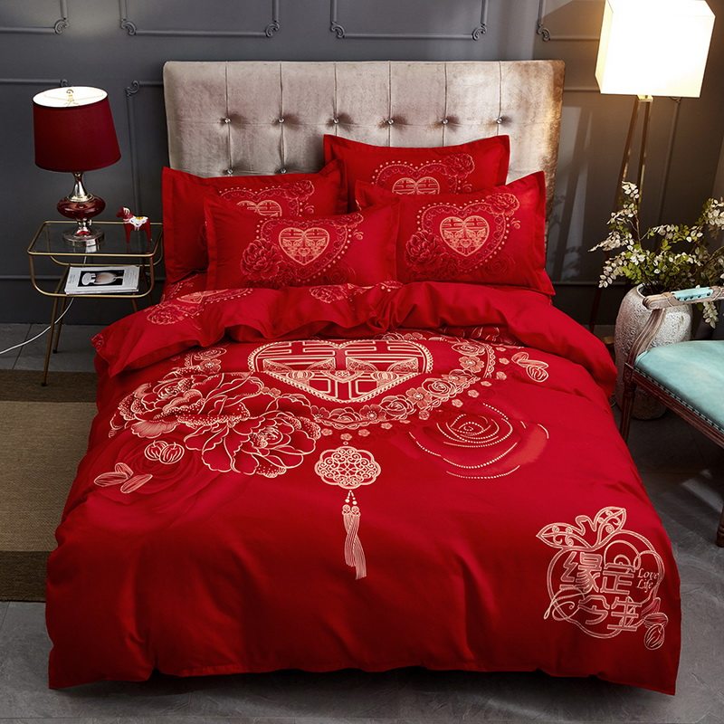 100%亲肤结婚床上用品四件套中式大红色全棉纯棉四季通用婚庆套件