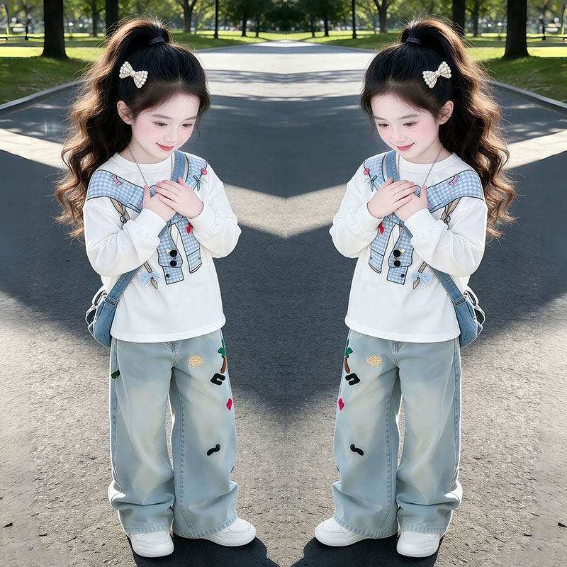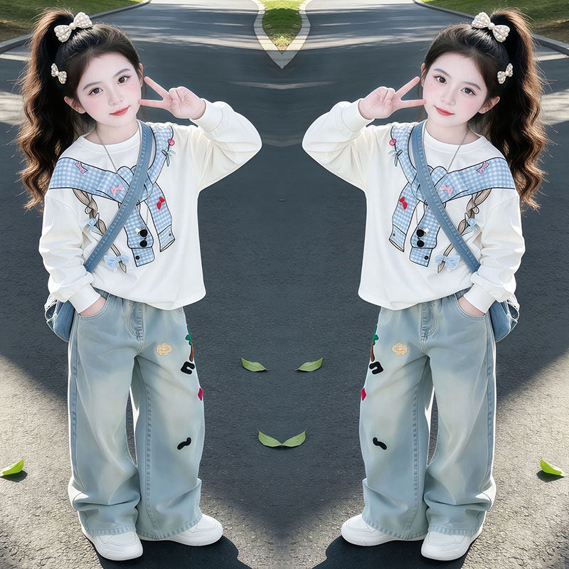 女童春季套装2026新款洋气时髦长袖卫衣中大童潮酷牛仔裤两件套潮