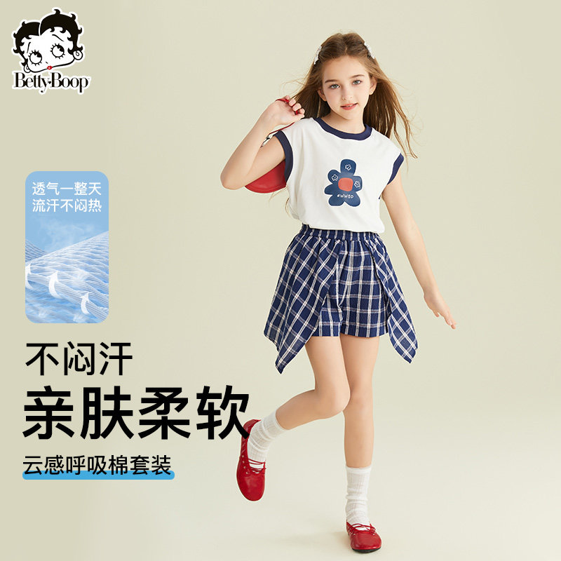 贝蒂女童洋气短袖不规则格子裤裙套装2026年夏季中大童时髦两件套