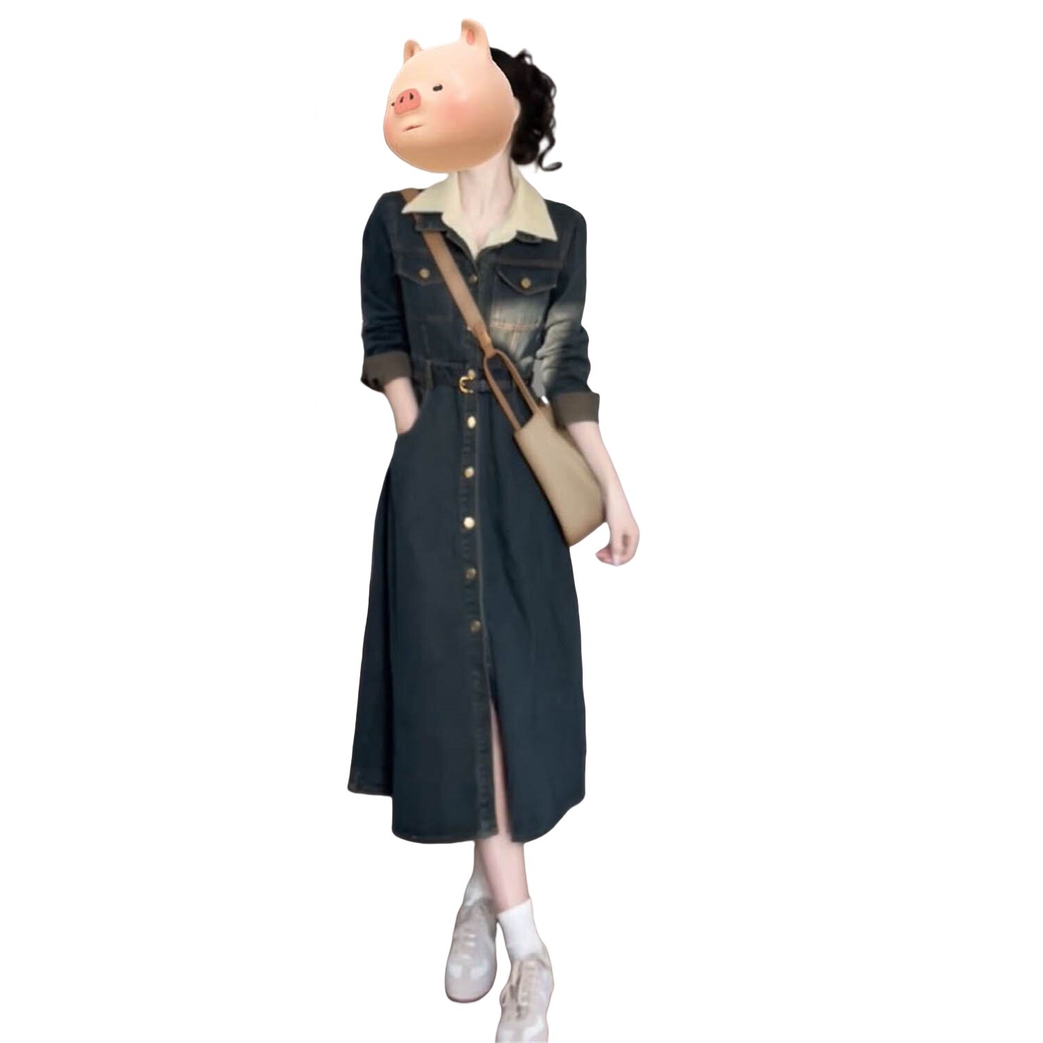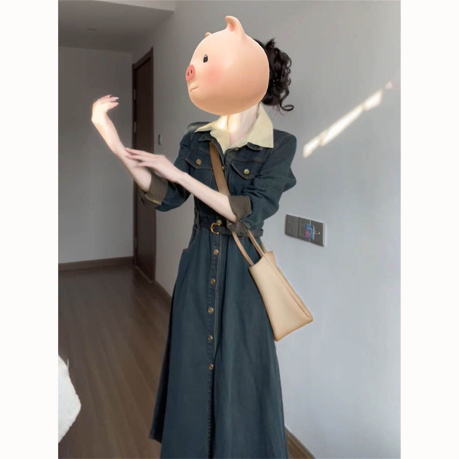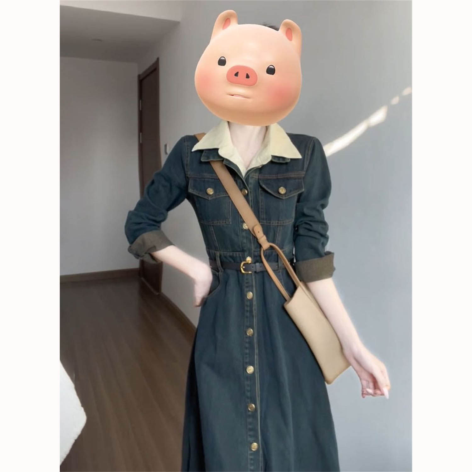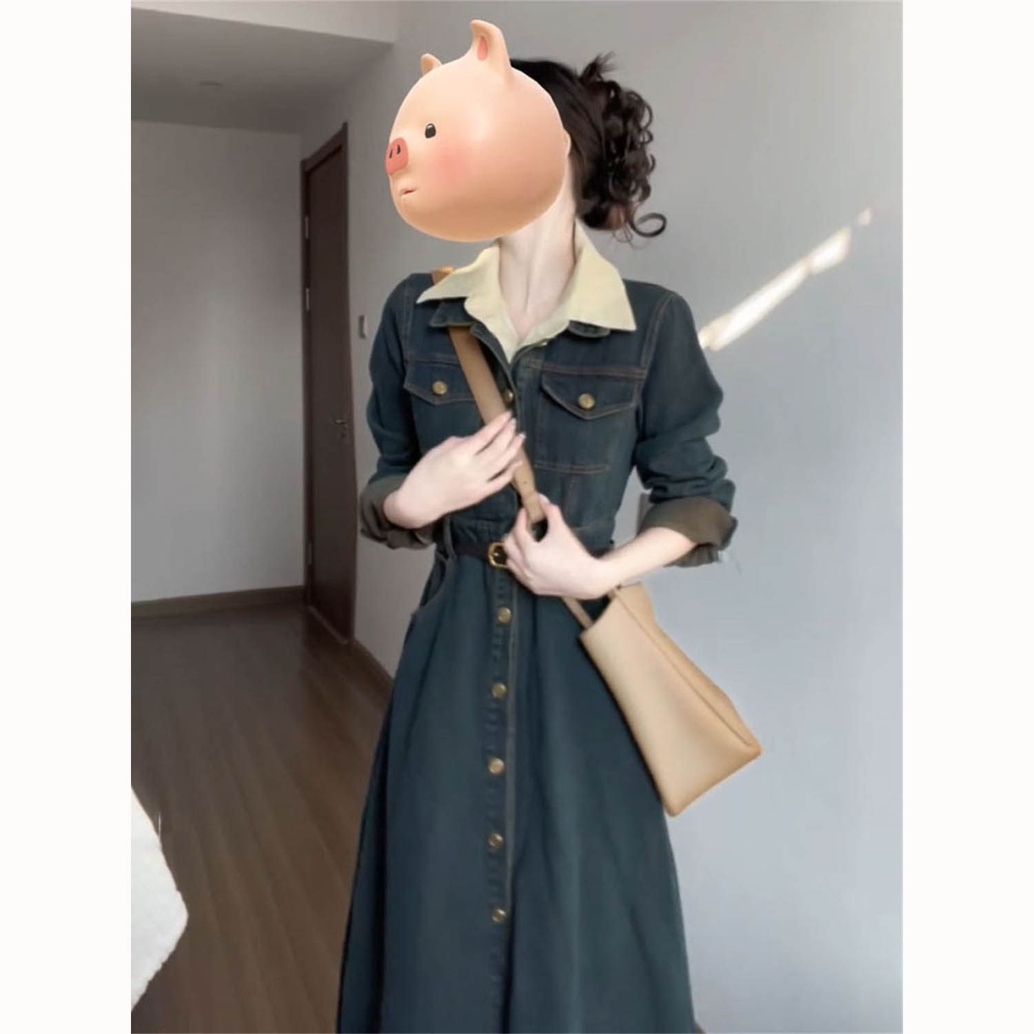 法式复古学院风假两件牛仔连衣裙女2025春季新款时尚收腰A字长裙