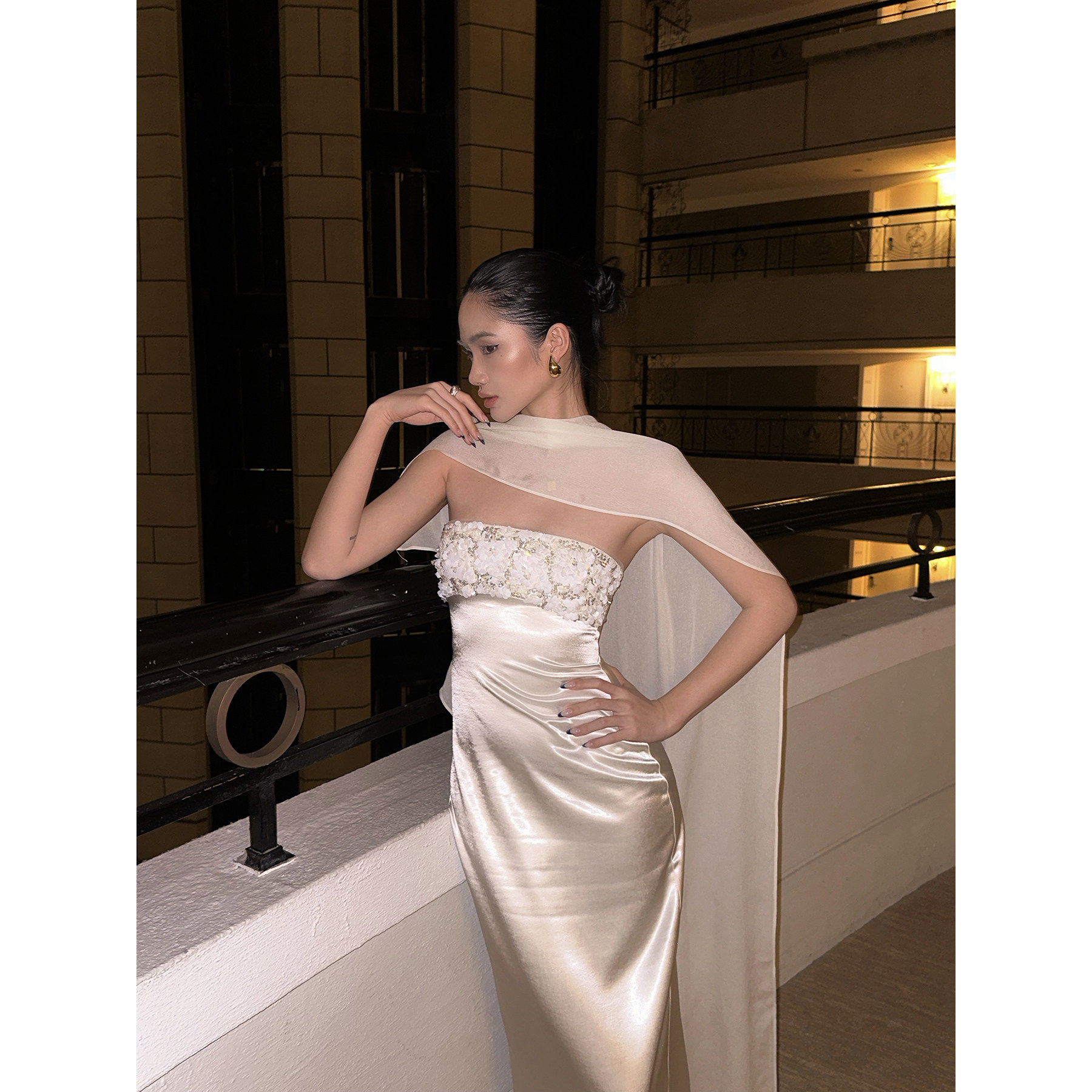 rovente 流光盛宴白色抹胸连衣裙女修身显瘦披肩亮片名媛礼服长裙