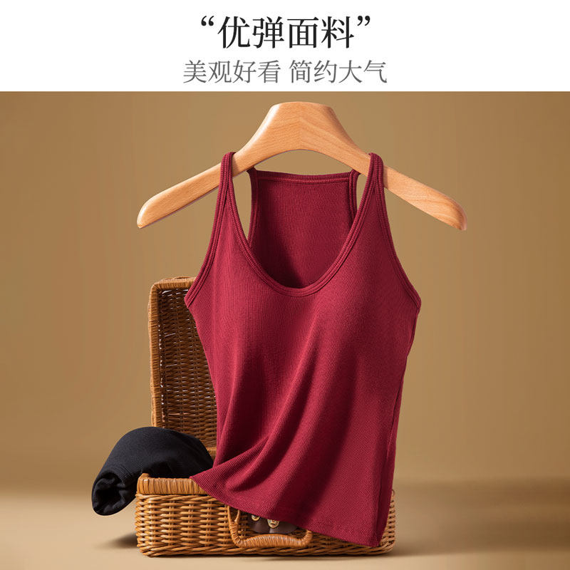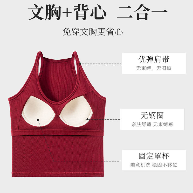 运动瑜伽红色家居服无袖女防走光免穿文胸带胸垫一体背心吊带上衣