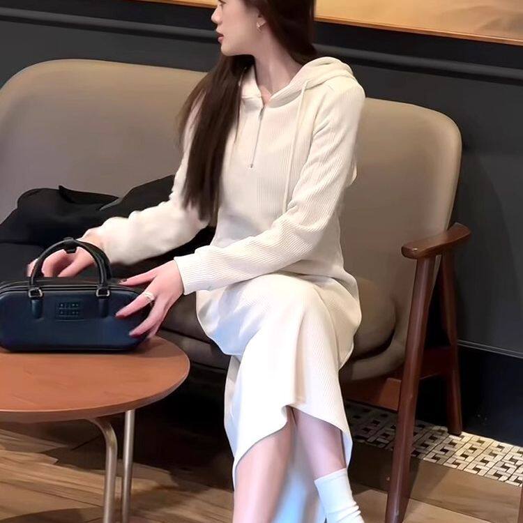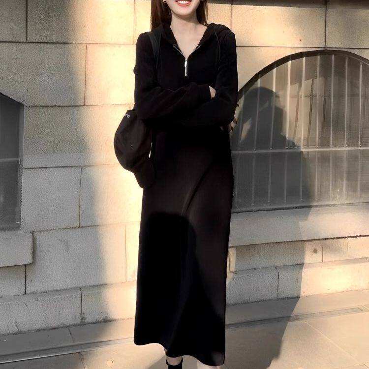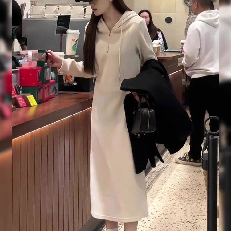 大码气质连帽长款连衣裙女春秋季新款胖MM宽松显瘦过膝长裙240斤