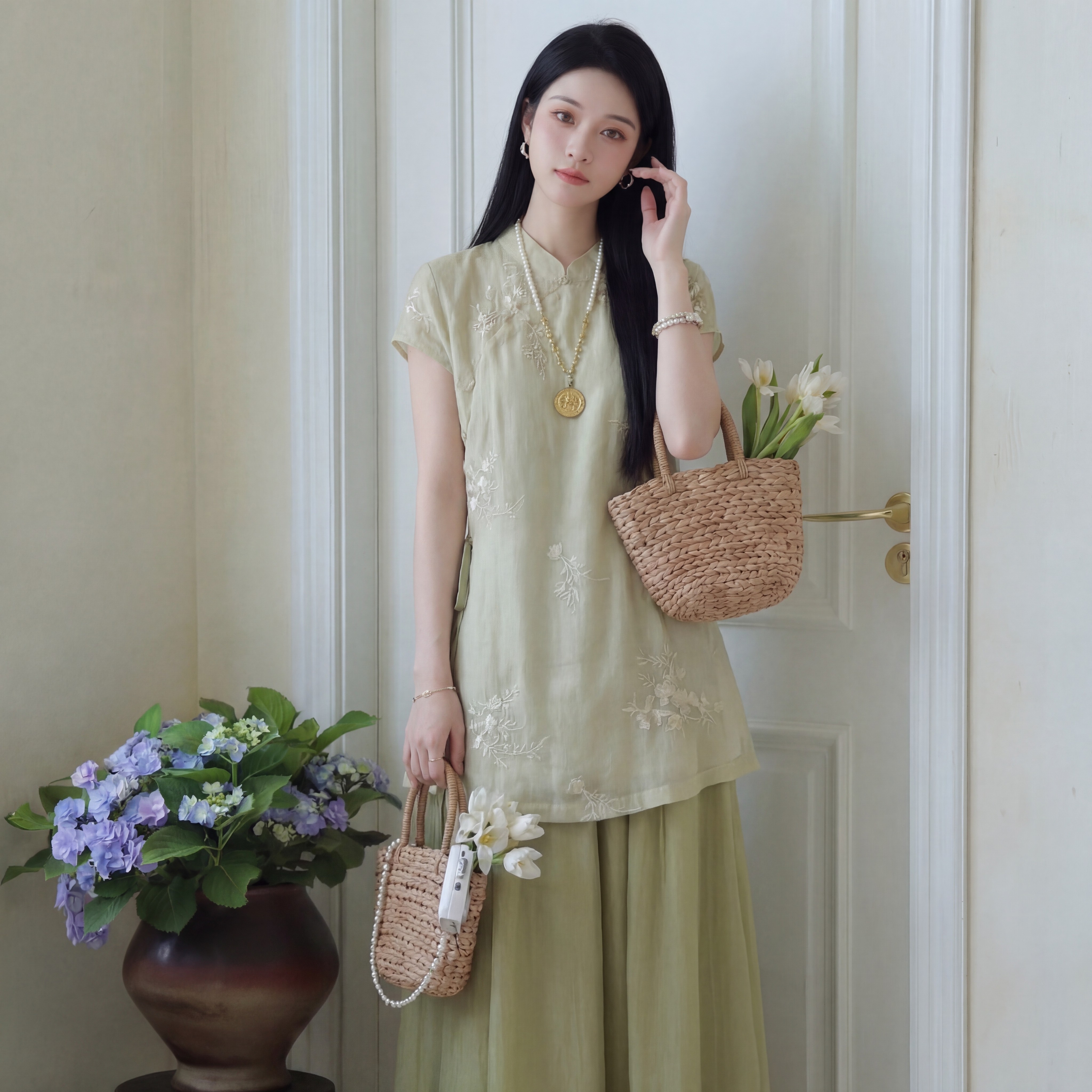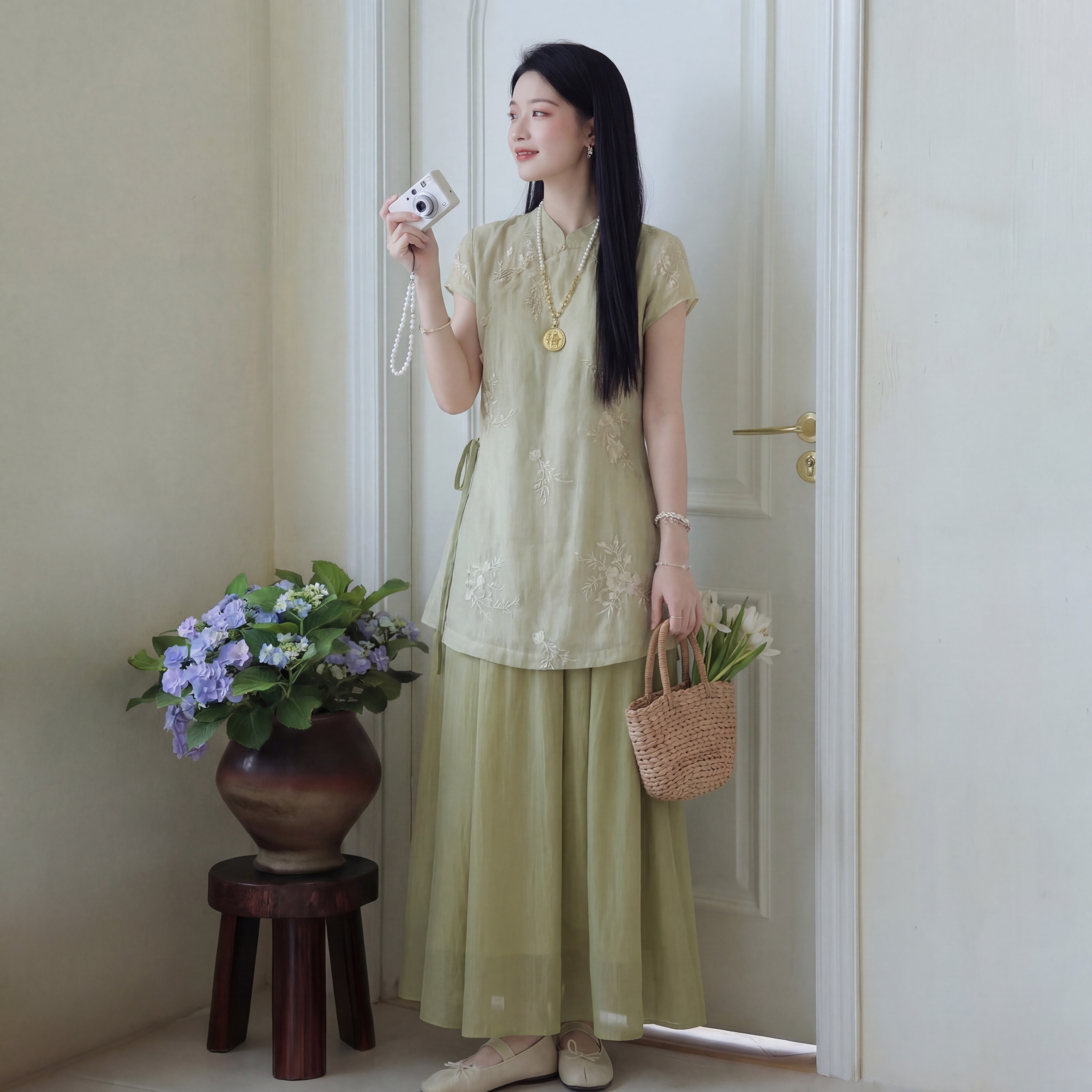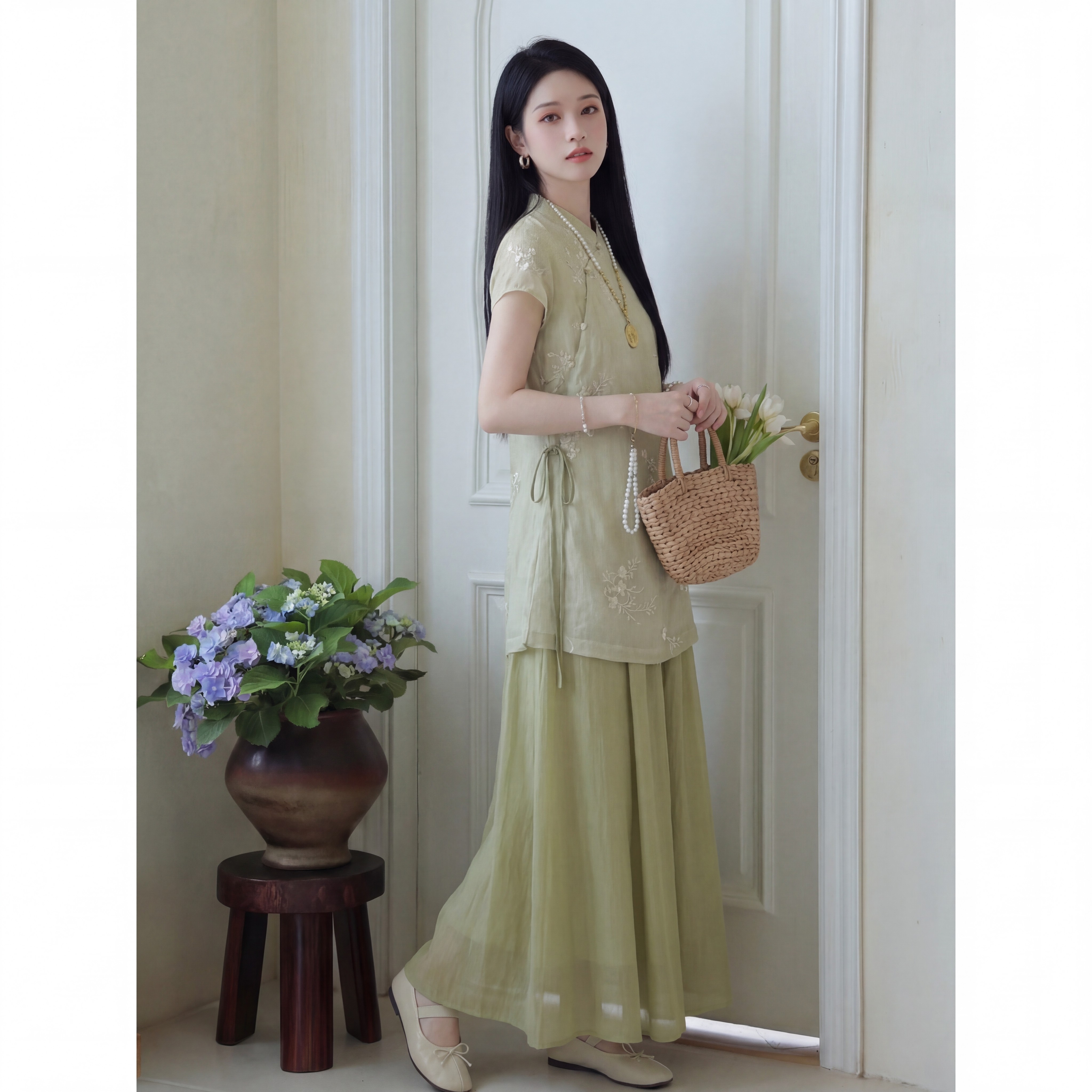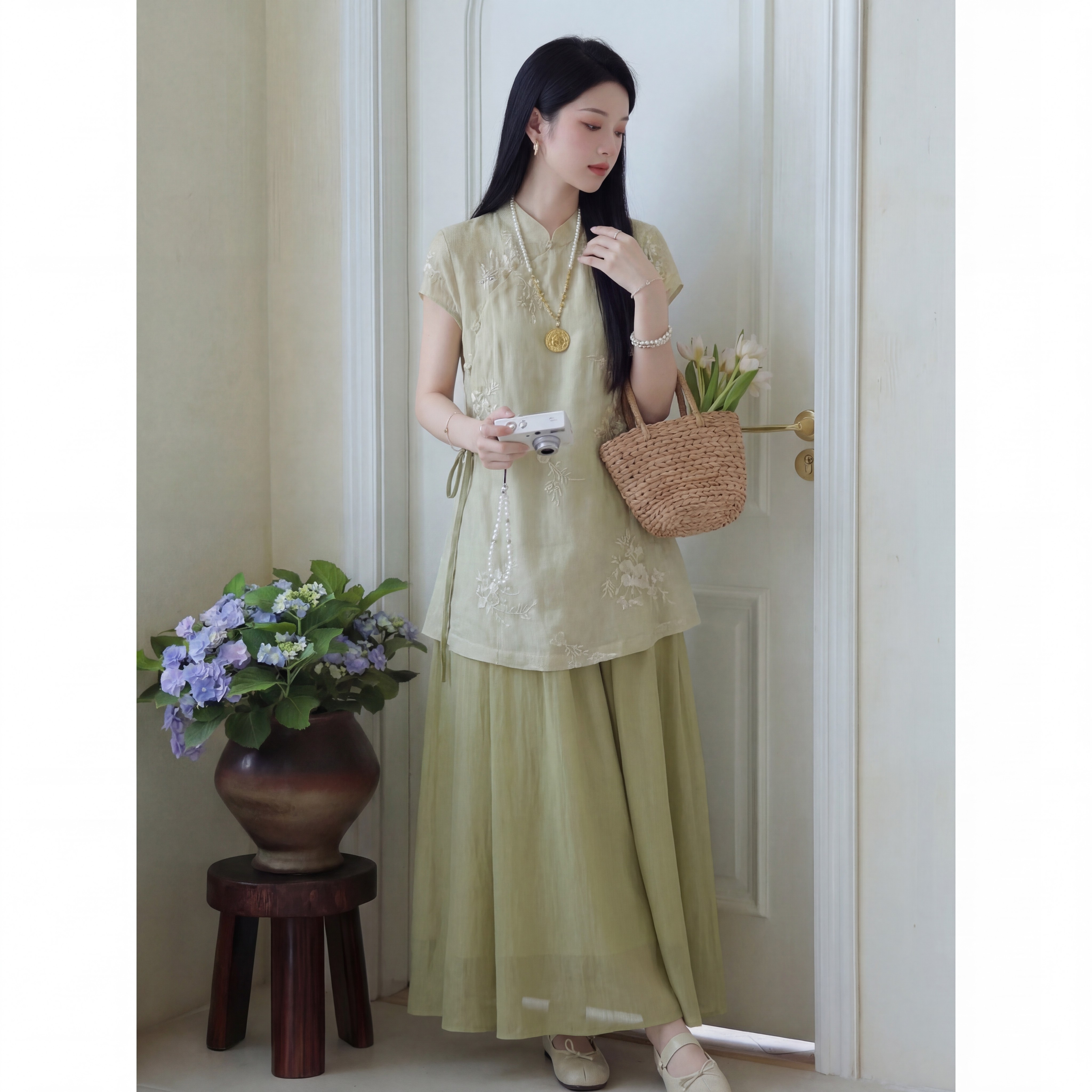 新中式绿色气质上衣吊带连衣裙显瘦收腰两件套装2026年春夏季新款