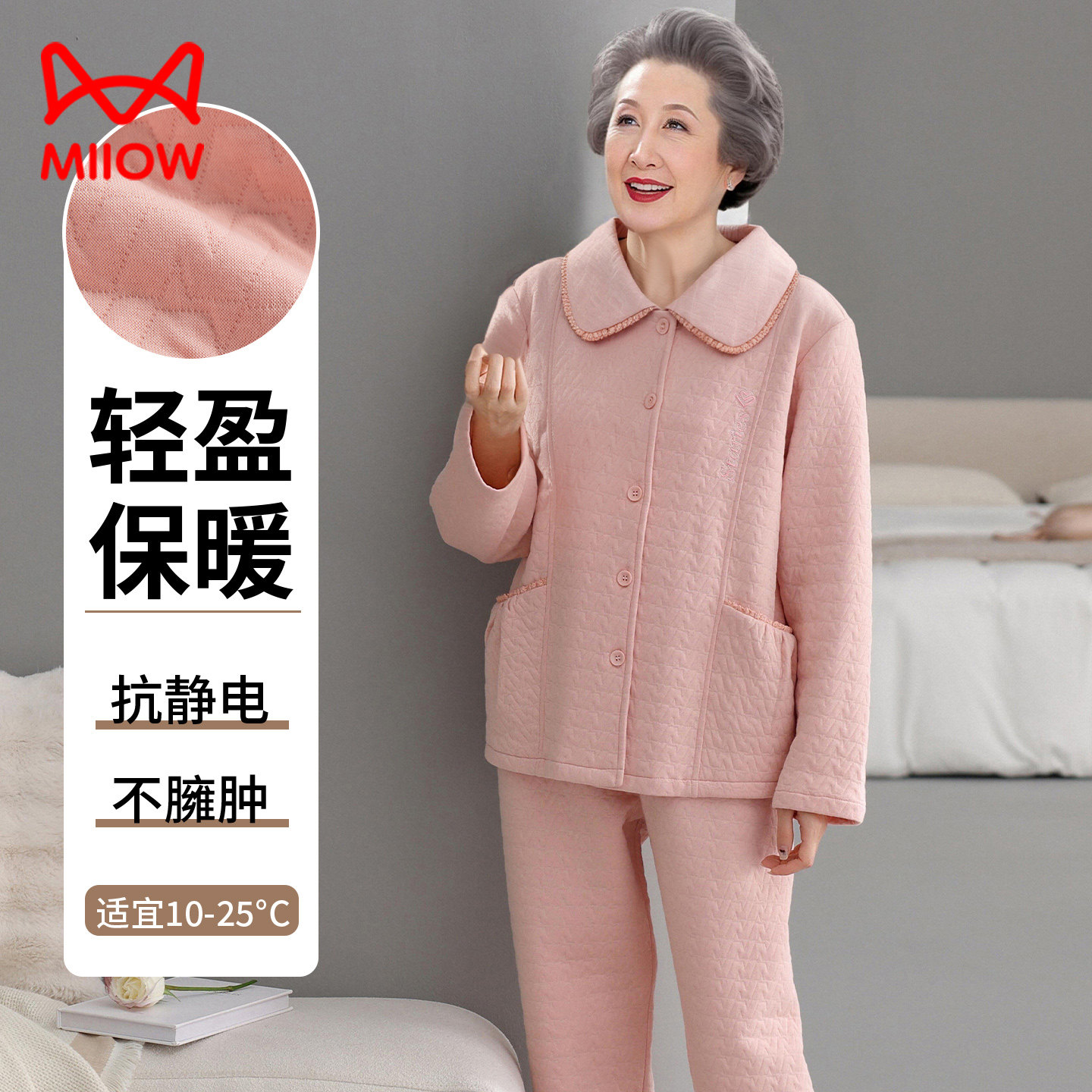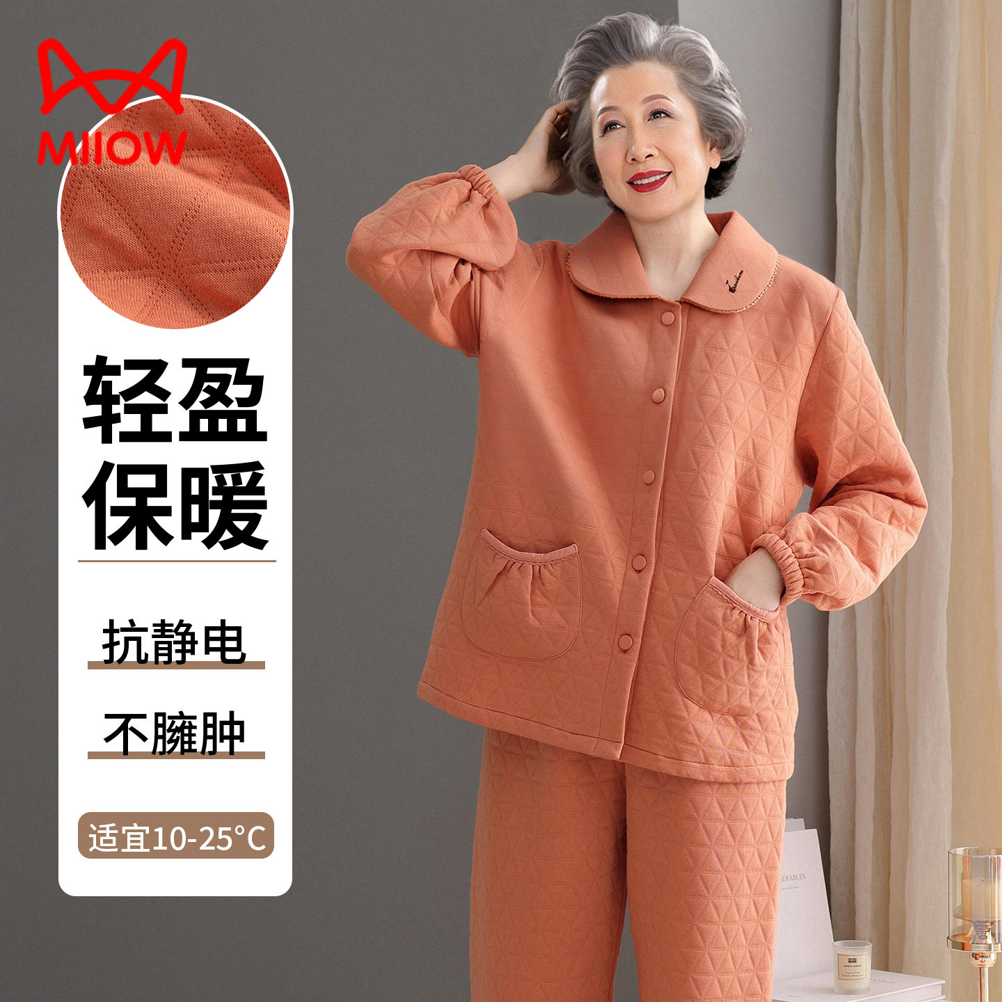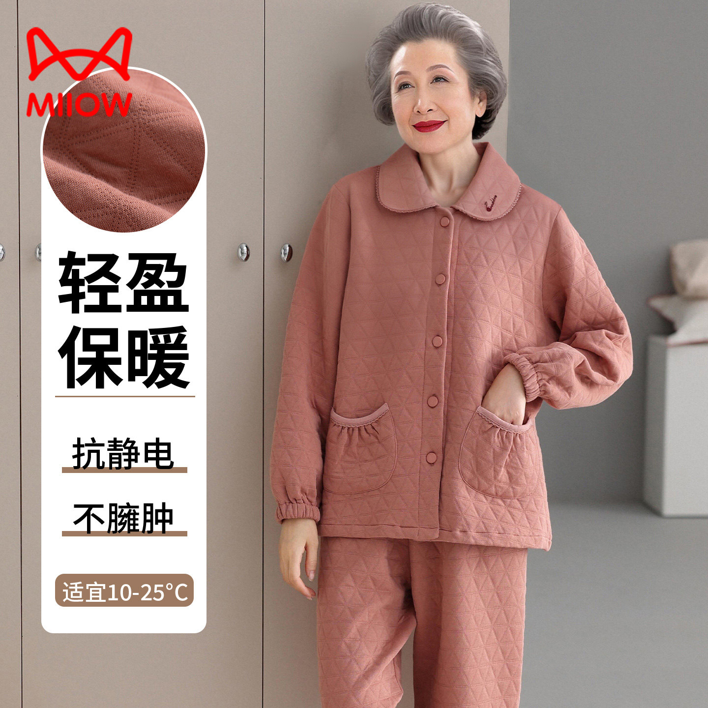 猫人妈妈睡衣女春秋加厚纯棉冬中老年5060岁奶奶空气棉夹层家居服