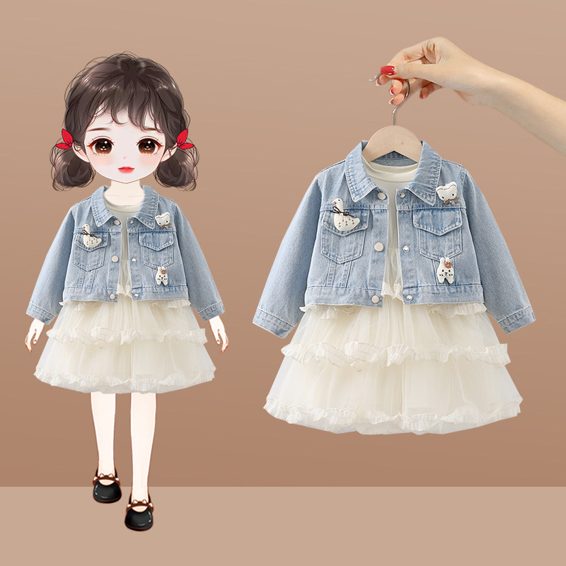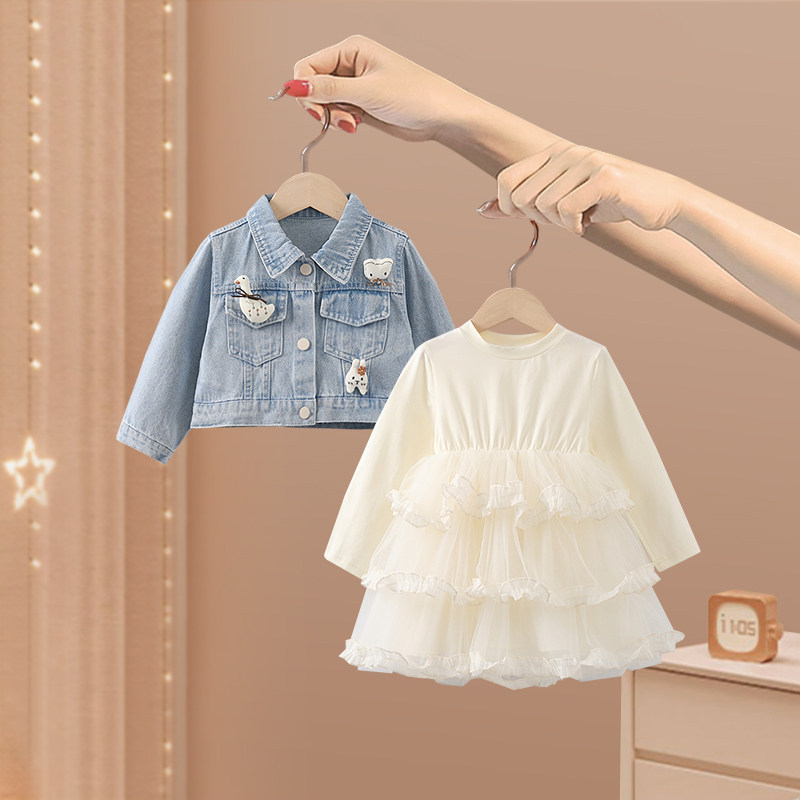 女童套装春秋季2026新款洋气宝宝公主裙子儿童春装牛仔外套连衣裙