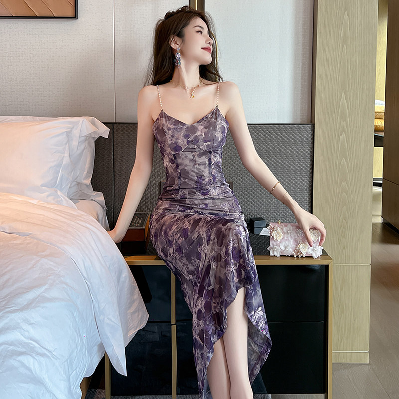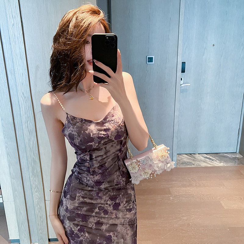 名媛碎花沙滩吊带裙夏季女修身小众长款鱼尾裙收腰性感v领连衣裙
