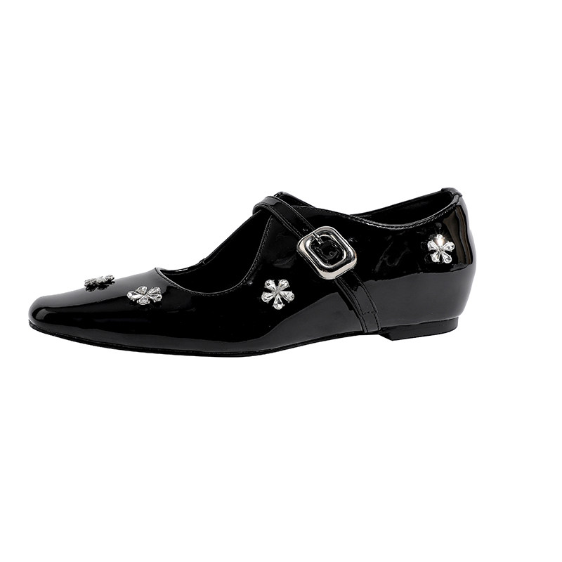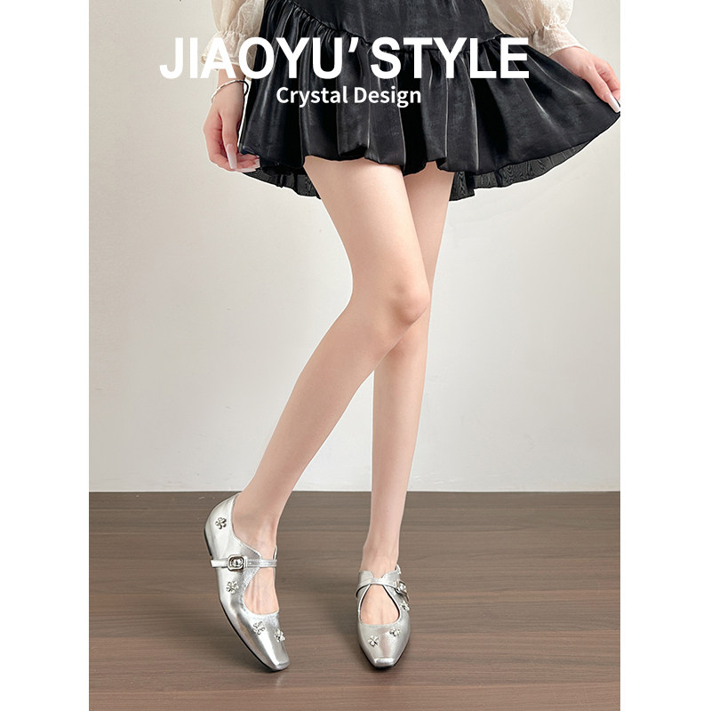 真皮~骄屿法式内增高方头一字扣带玛丽珍女花朵水钻气质时尚单鞋