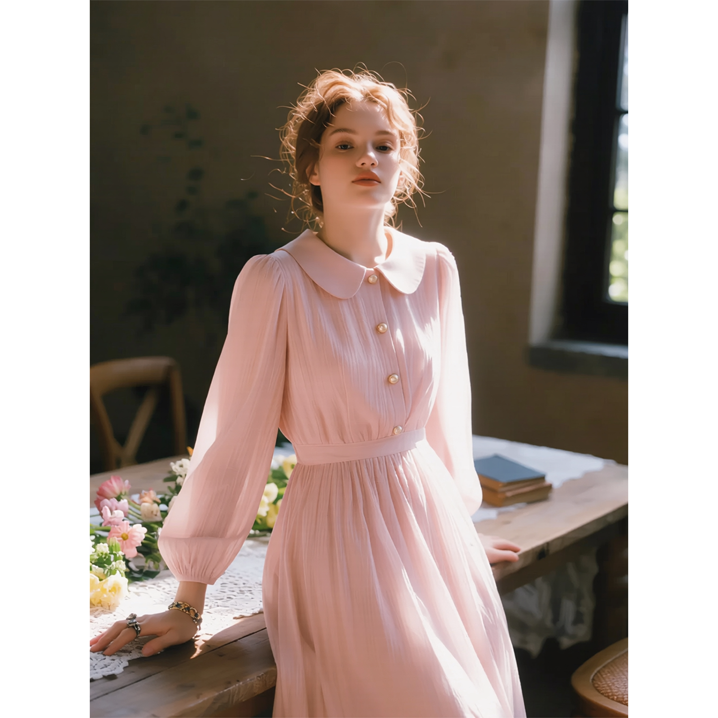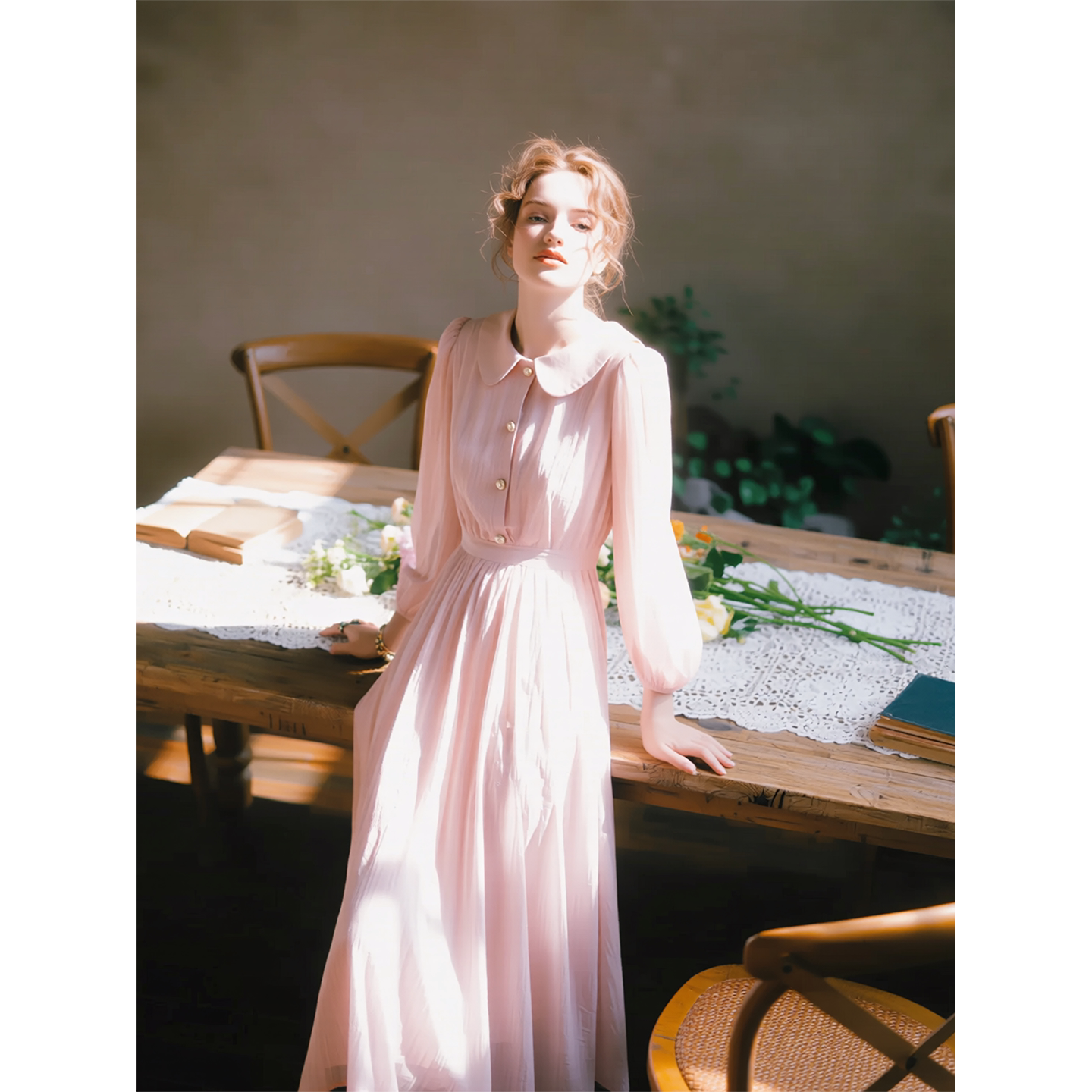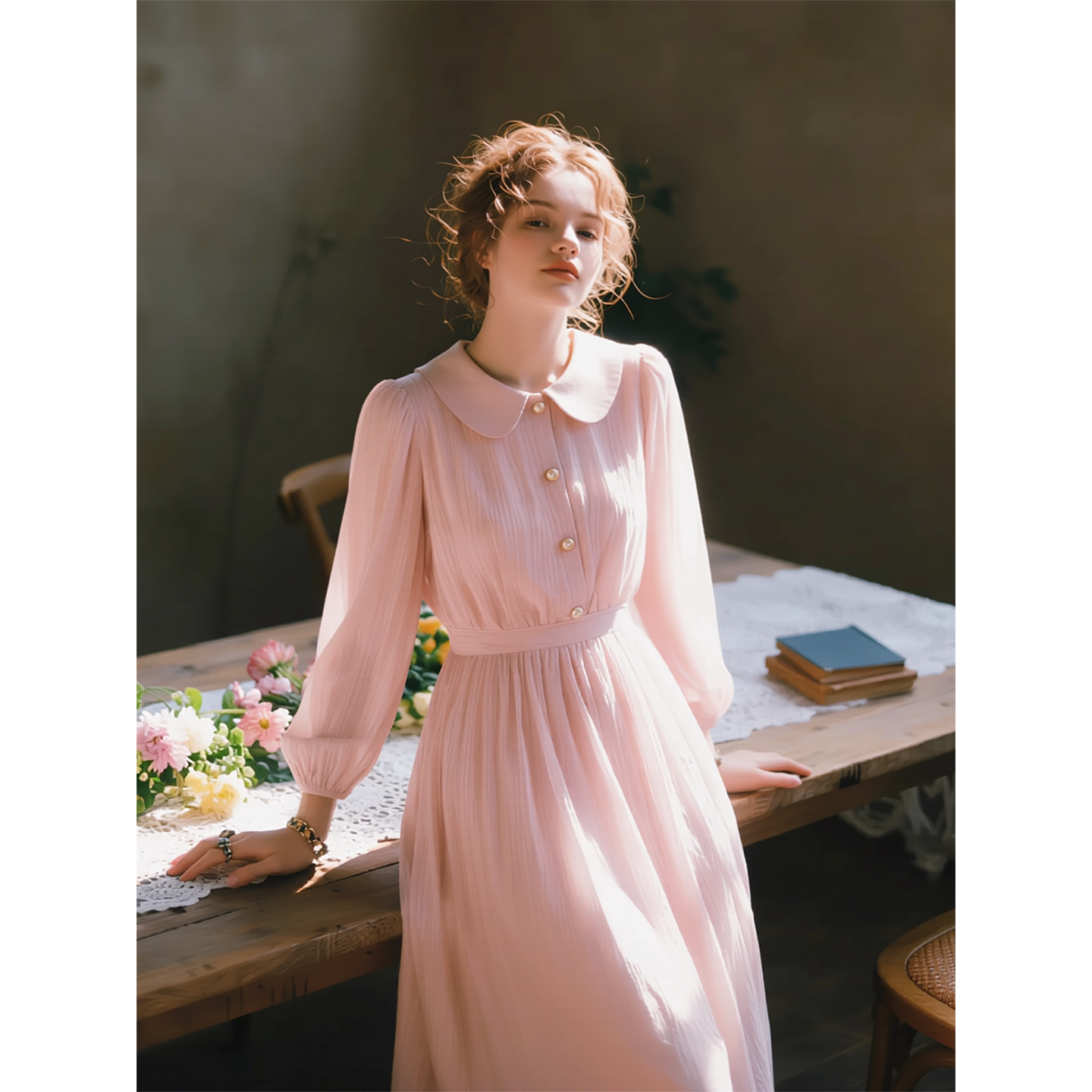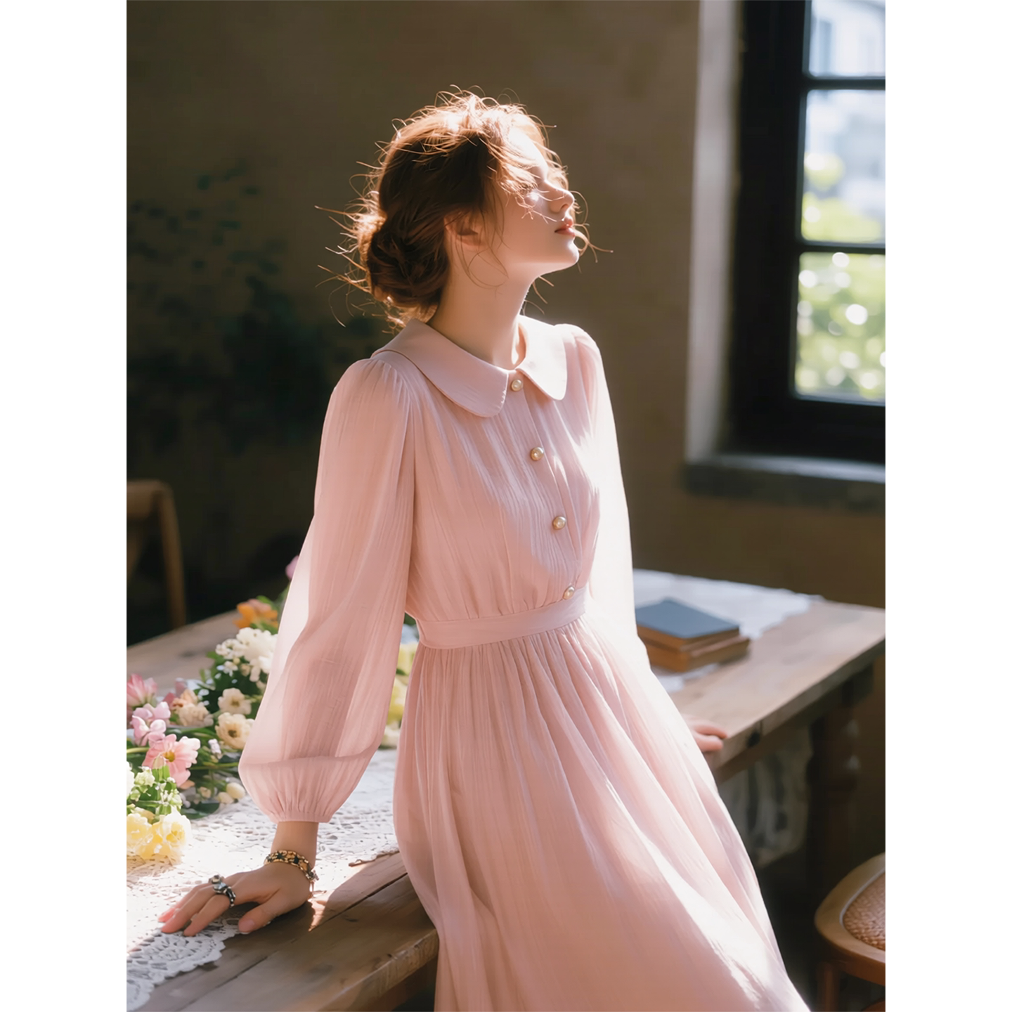 浅粉色娃娃领长袖连衣裙女2026年春季新款法式气质早春漂亮裙子