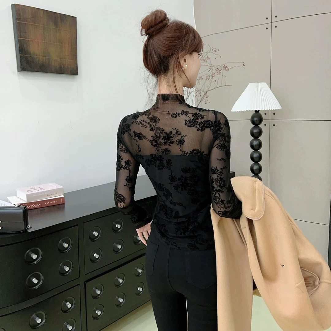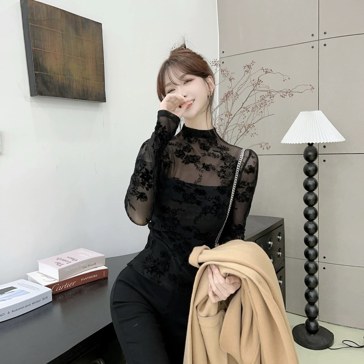 卡卡女装官方旗舰店正品半高领轻熟蕾丝衫透视性感上衣加绒打底衫