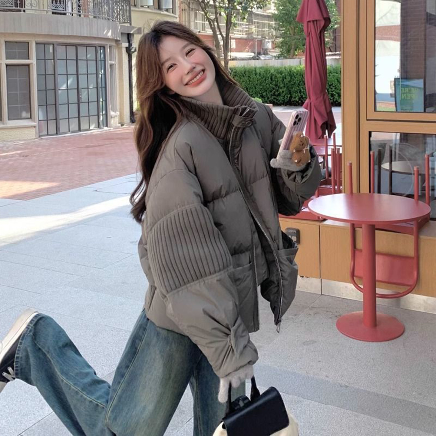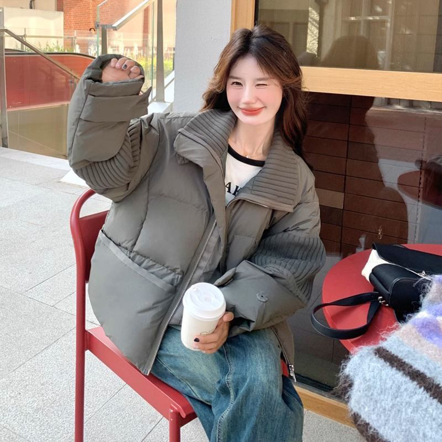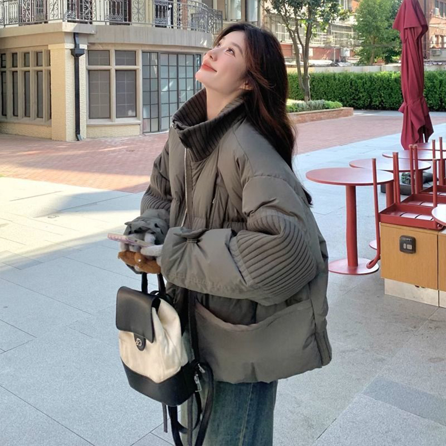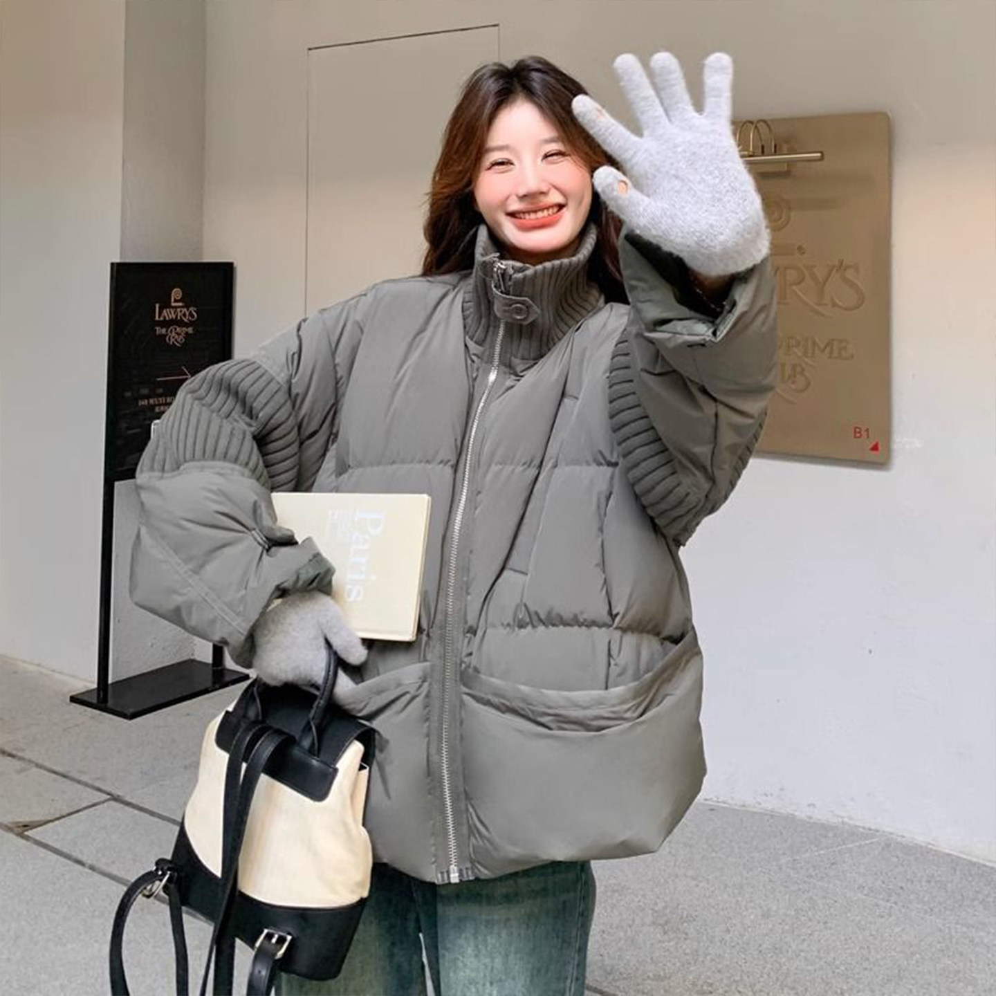 特大码胖mm韩版针织拼接立领棉服上衣女冬季宽松加厚保暖开衫外套
