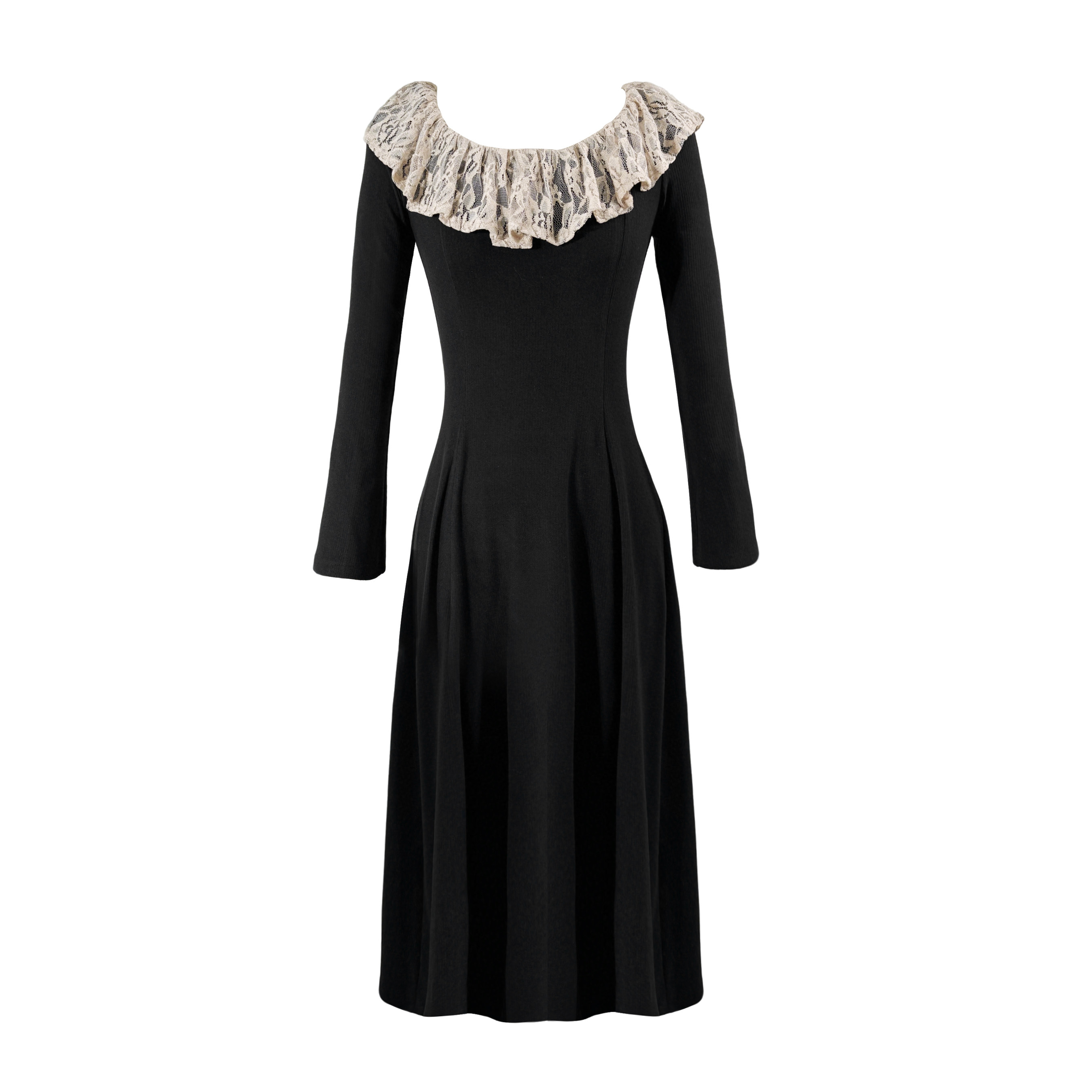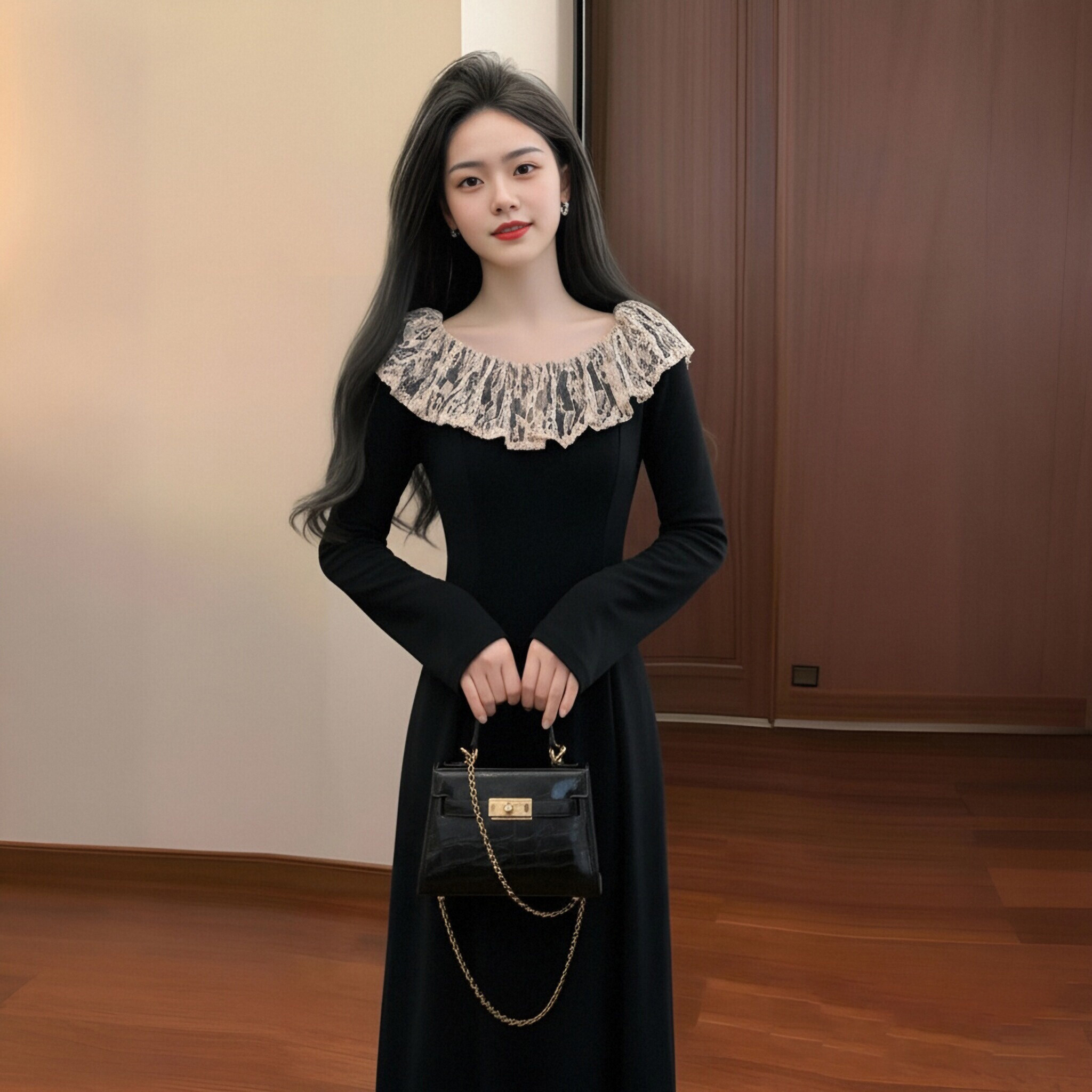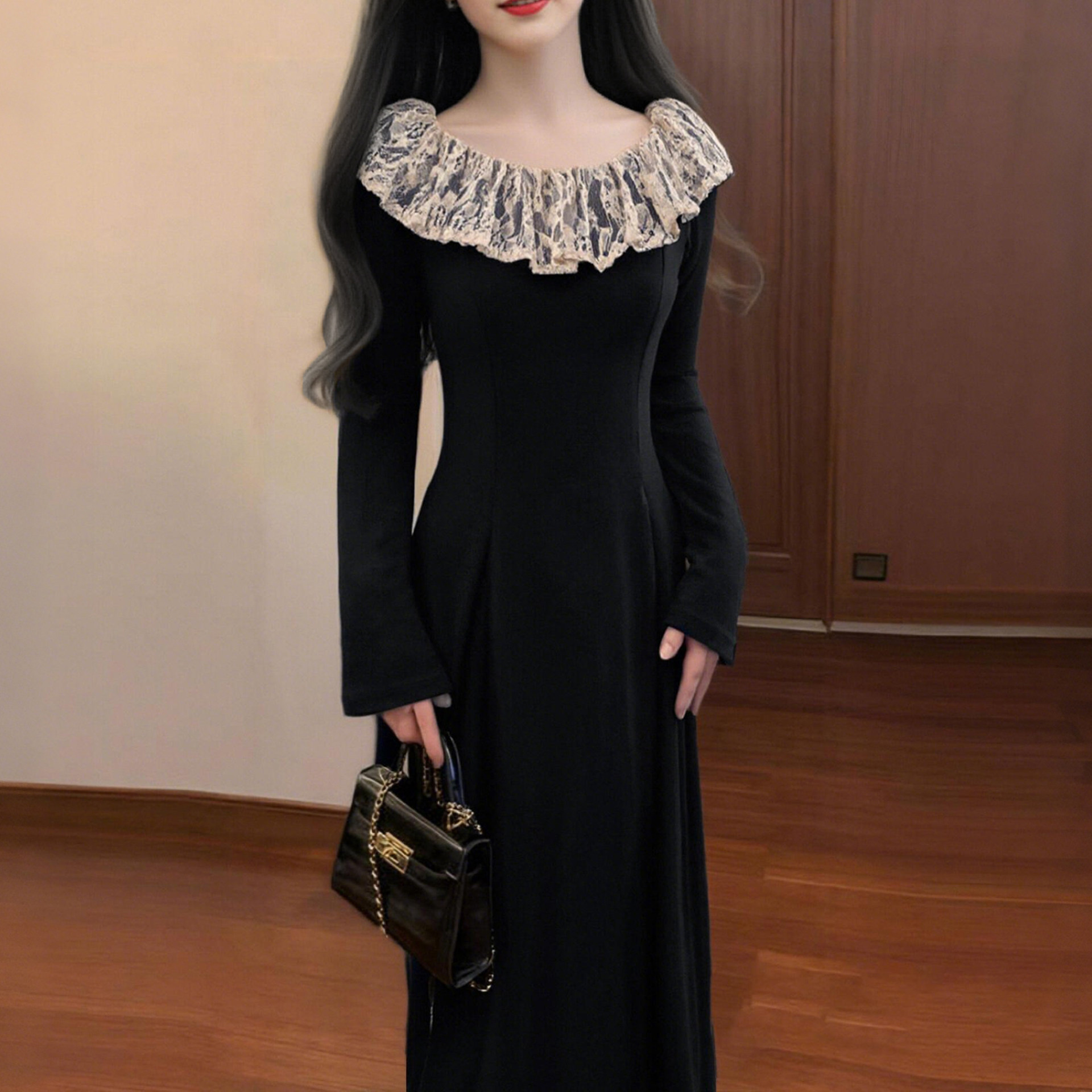 法式赫本风黑色长袖连衣裙 2026秋冬新款蕾丝拼接长裙D4268A