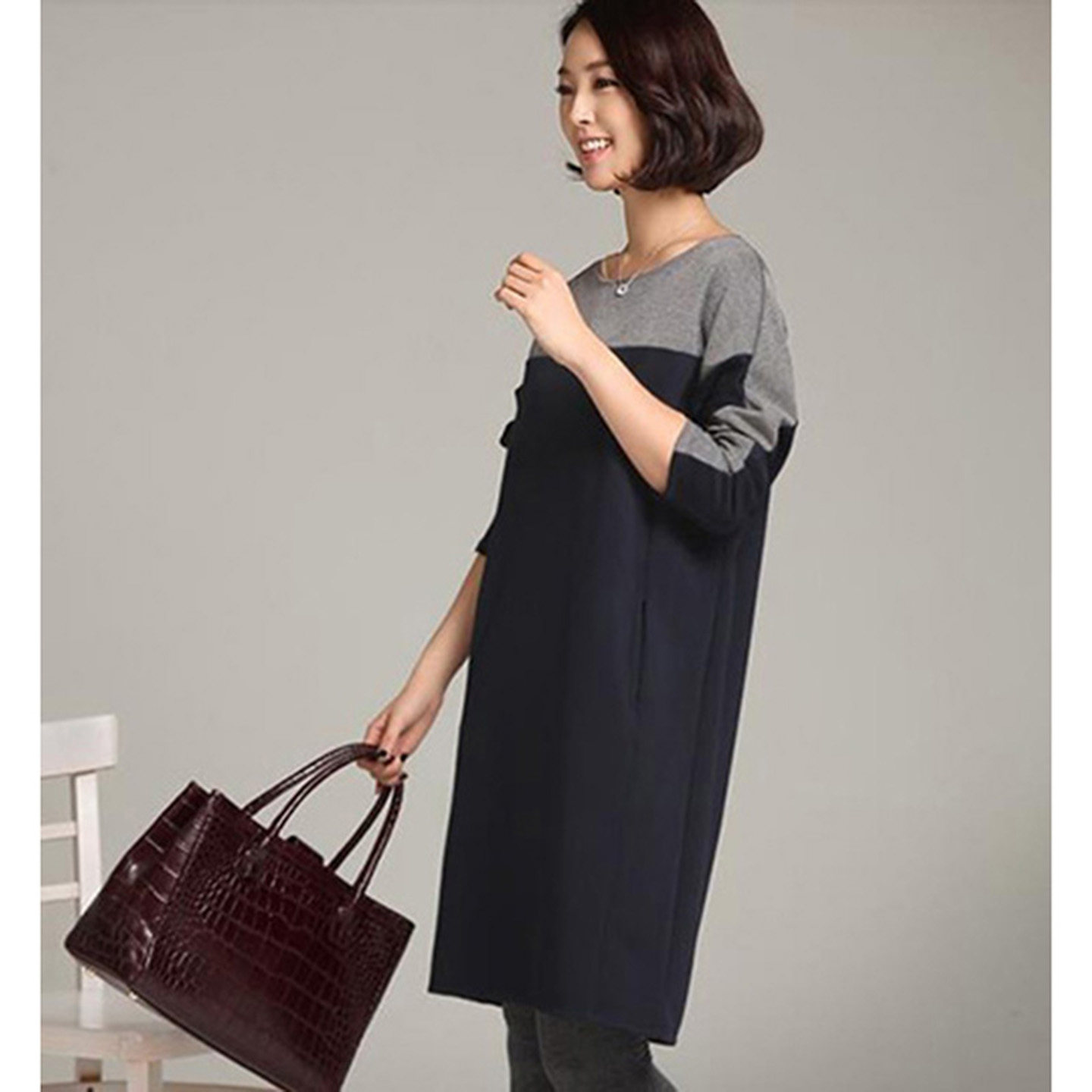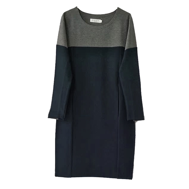 春秋加大码高端欧美简约长袖职业装弹力纯棉拼色时尚中长款连衣裙