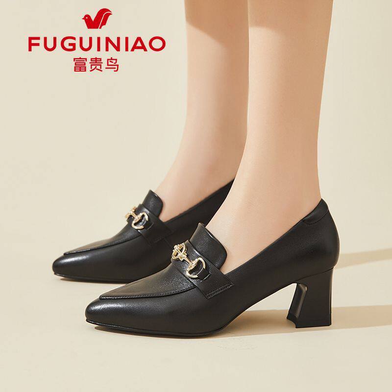 富贵鸟尖头乐福鞋女款2026新款春季单鞋气质配裙子高跟鞋真皮皮鞋