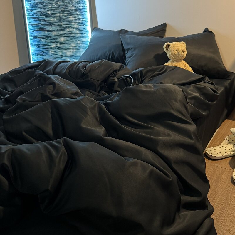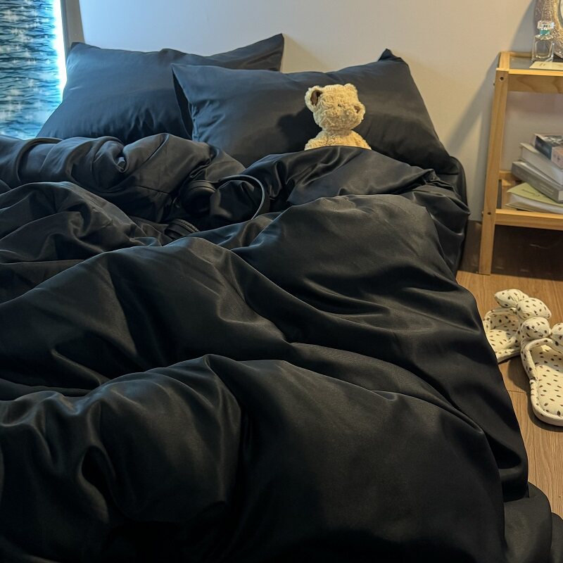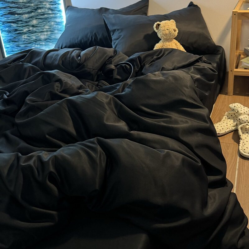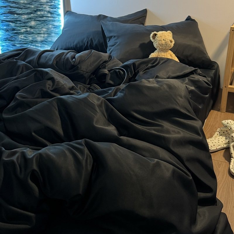 高级感黑色简约冰丝四件套水洗真丝被套丝滑裸睡夏季床上三件套