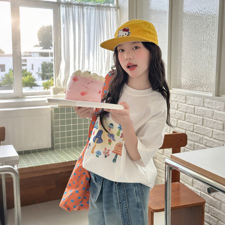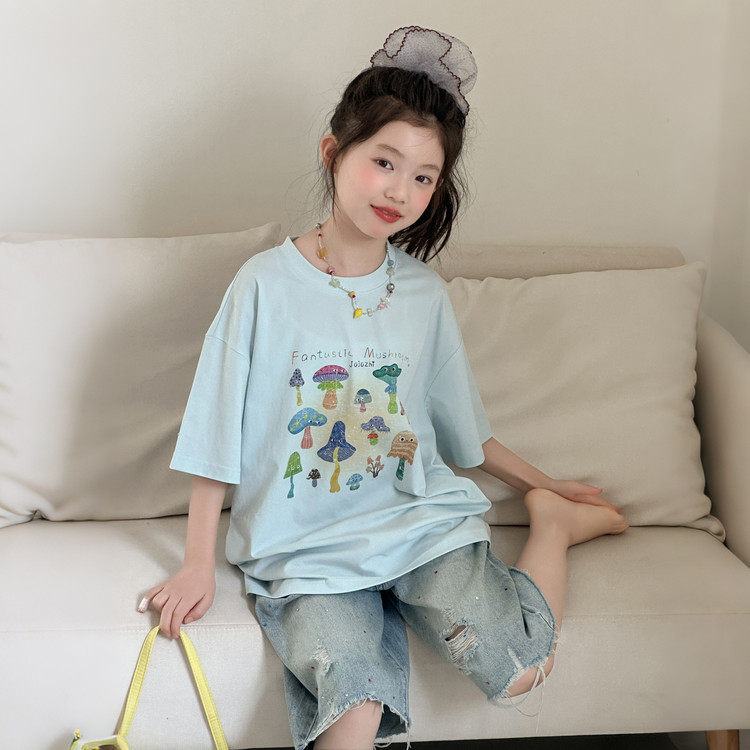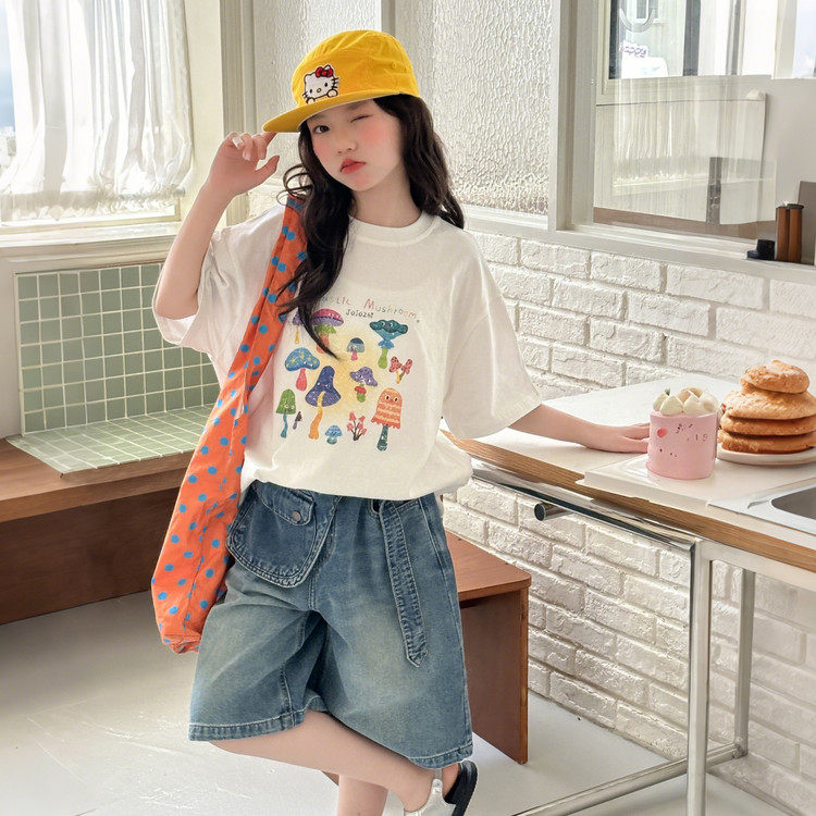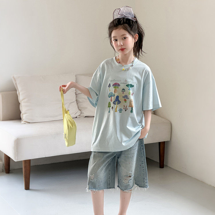 女童短袖套装夏季新款10-16中大童印花T恤纯棉洋气牛仔中裤两件套