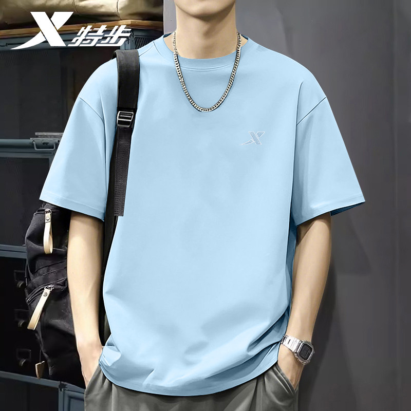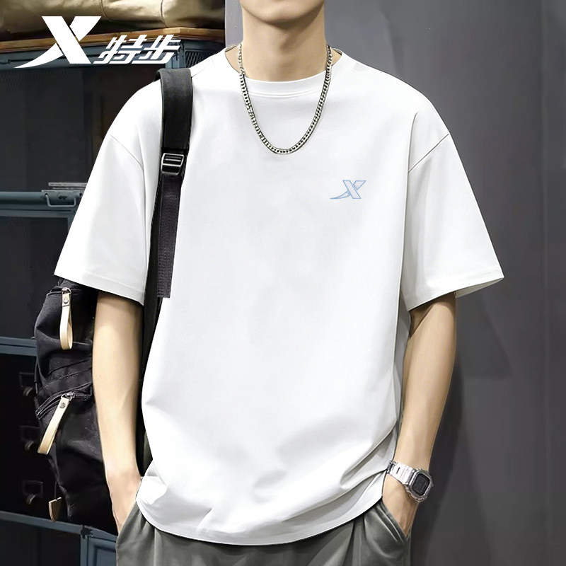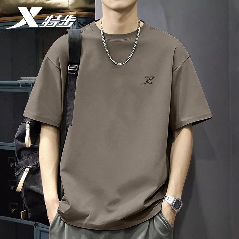 特步灰色短袖T恤男纯棉夏季透气圆领刺绣打底衫宽松大码运动上衣