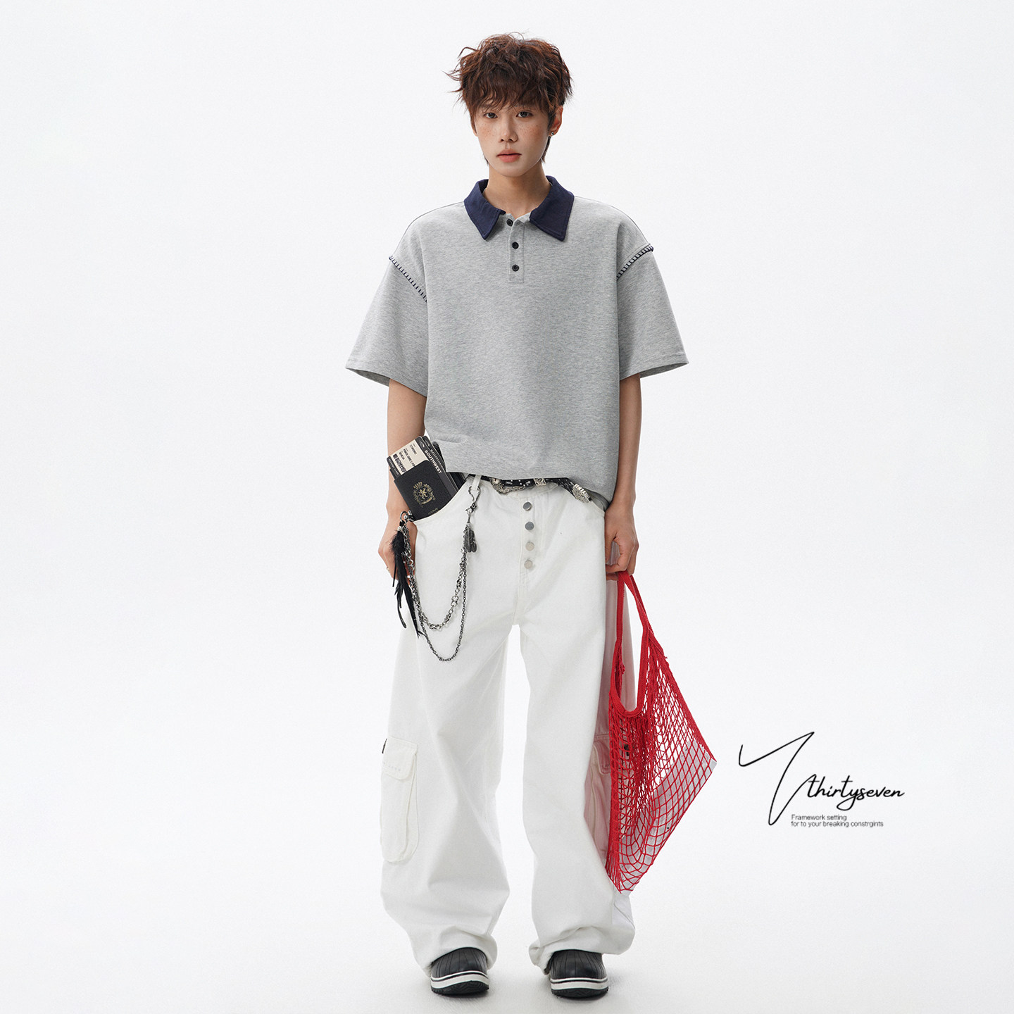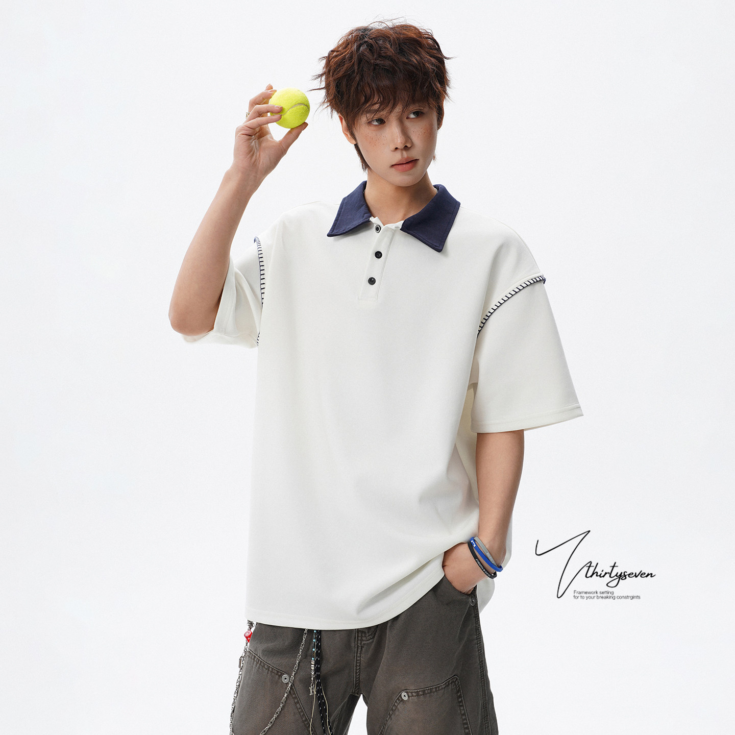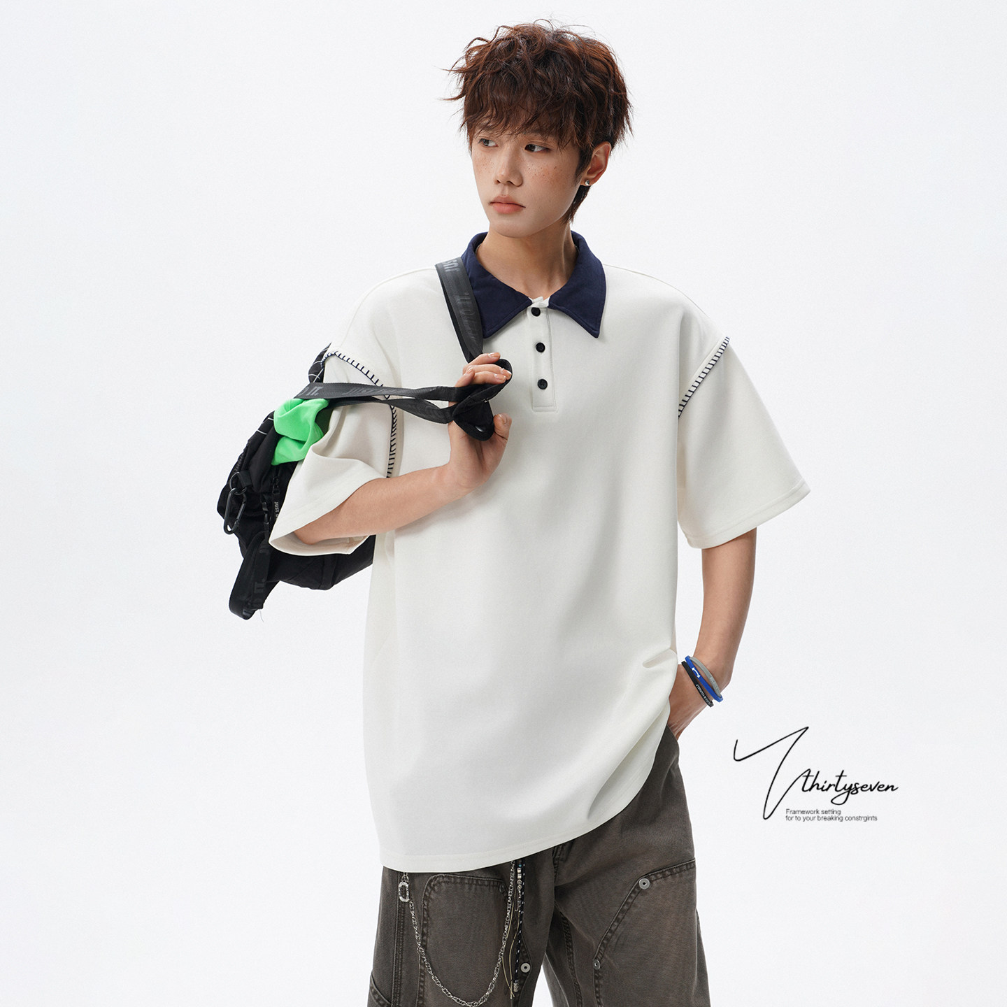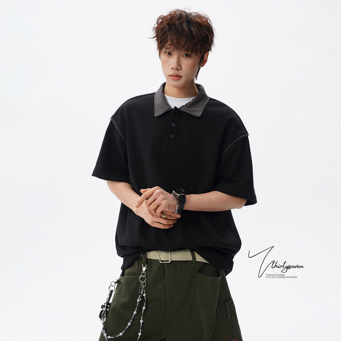 V37美式复古设计感拼接翻领polo衫男夏潮牌宽松休闲青少年短袖T恤