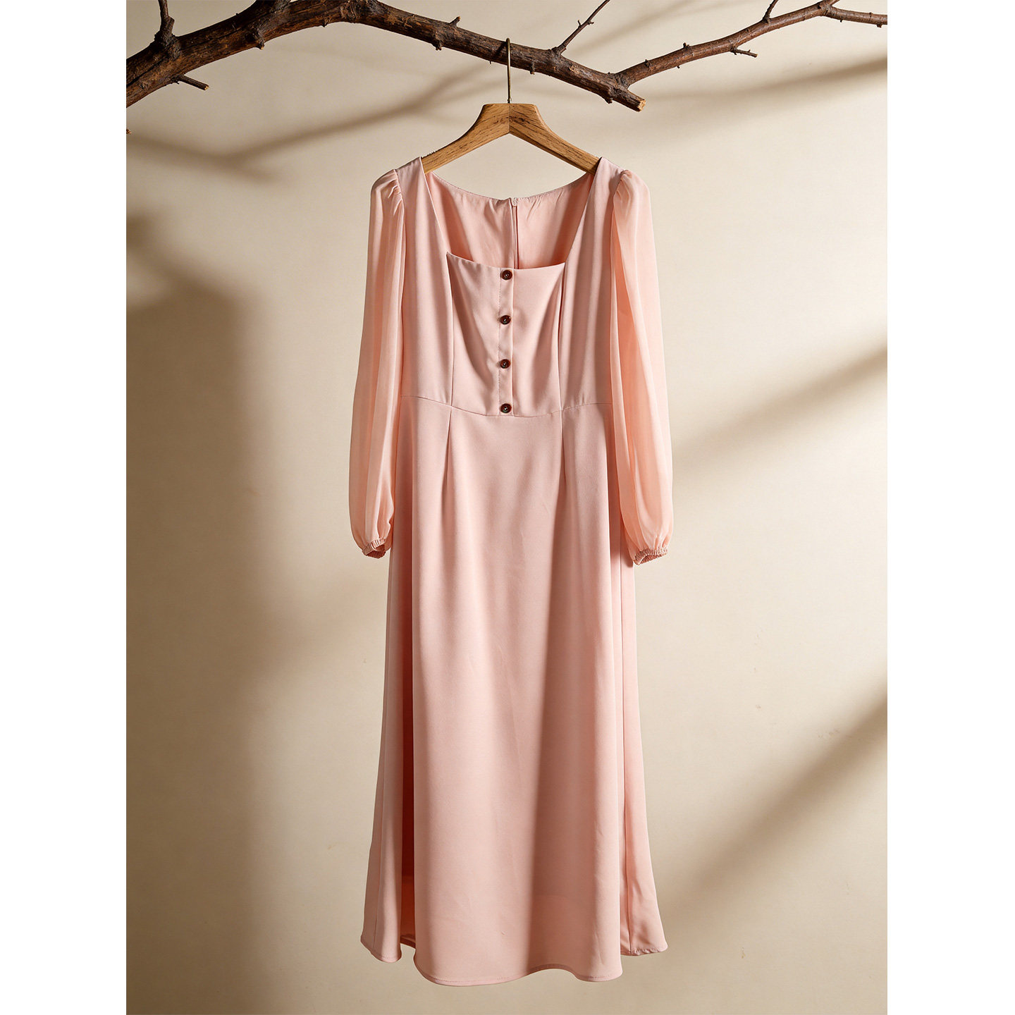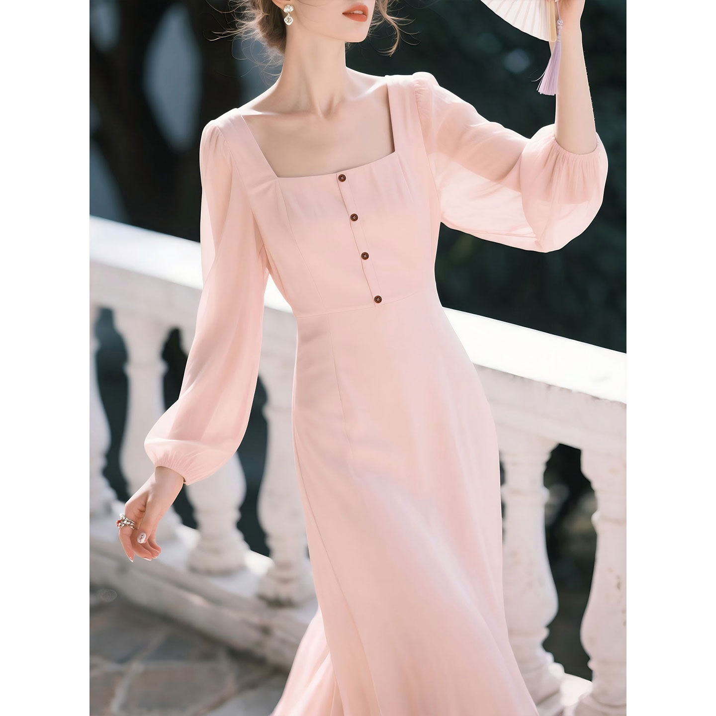 粉色方领雪纺长袖连衣裙女2026年春季新款法式巨好看的裙子