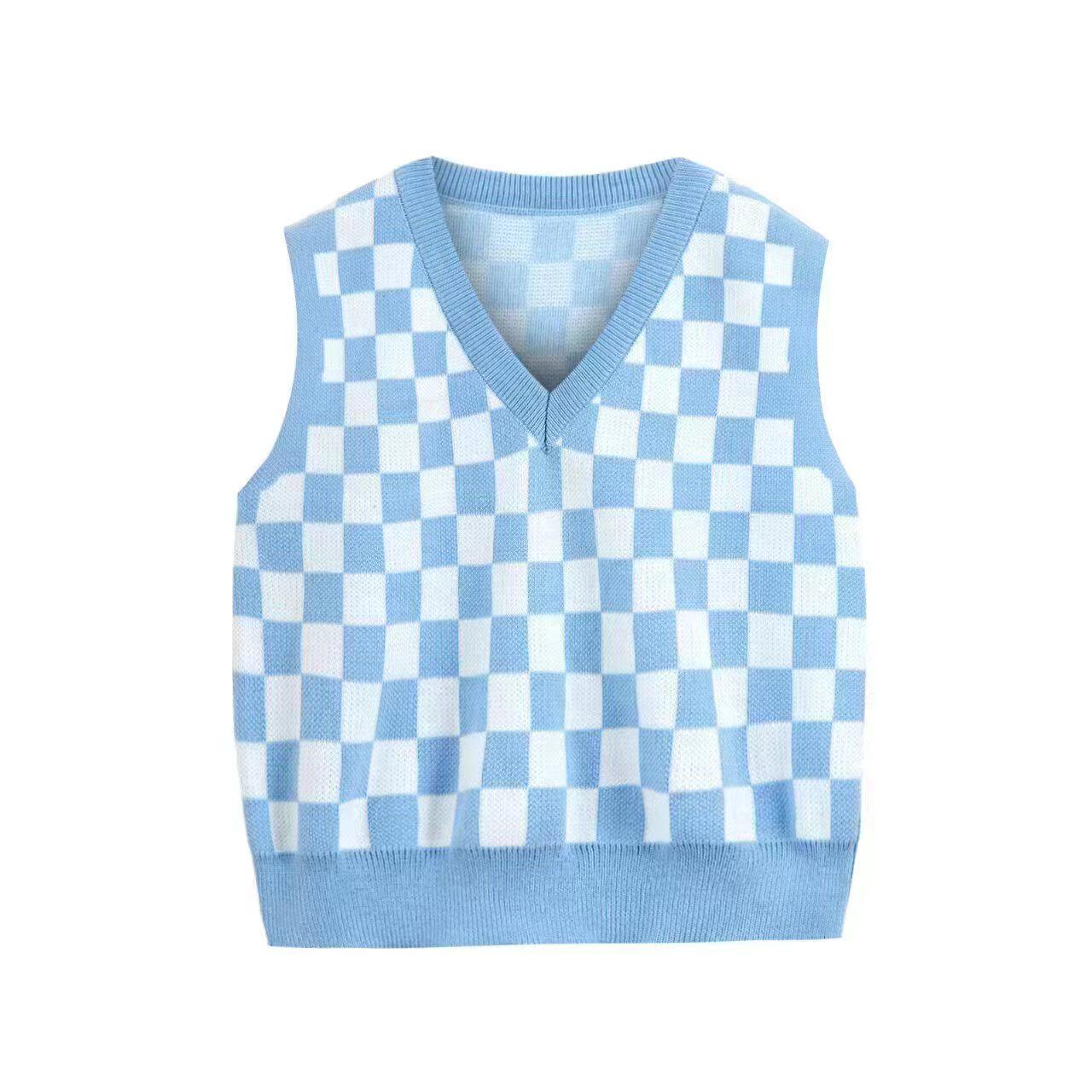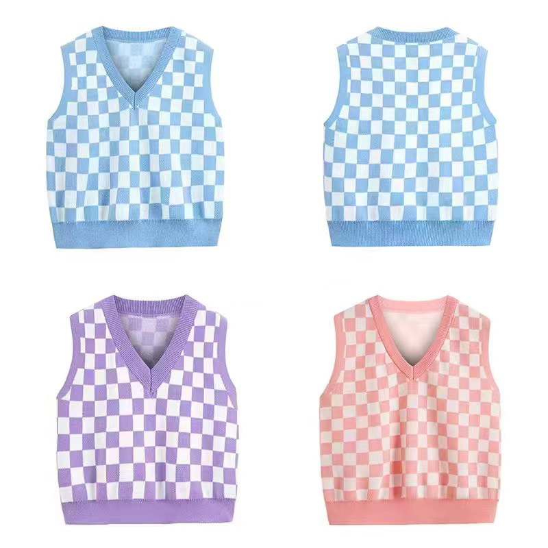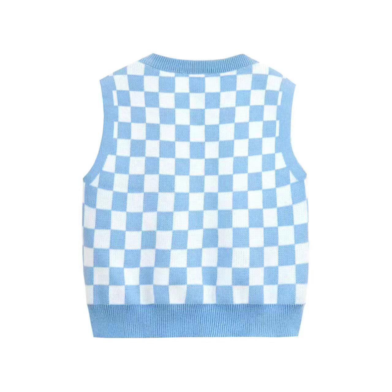 女童毛衣针织背心春秋新款中大童宝宝儿童V领格子坎肩外穿马甲