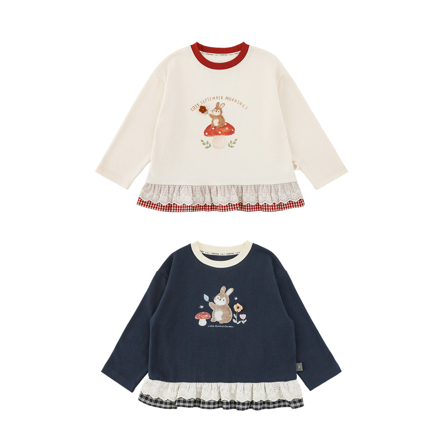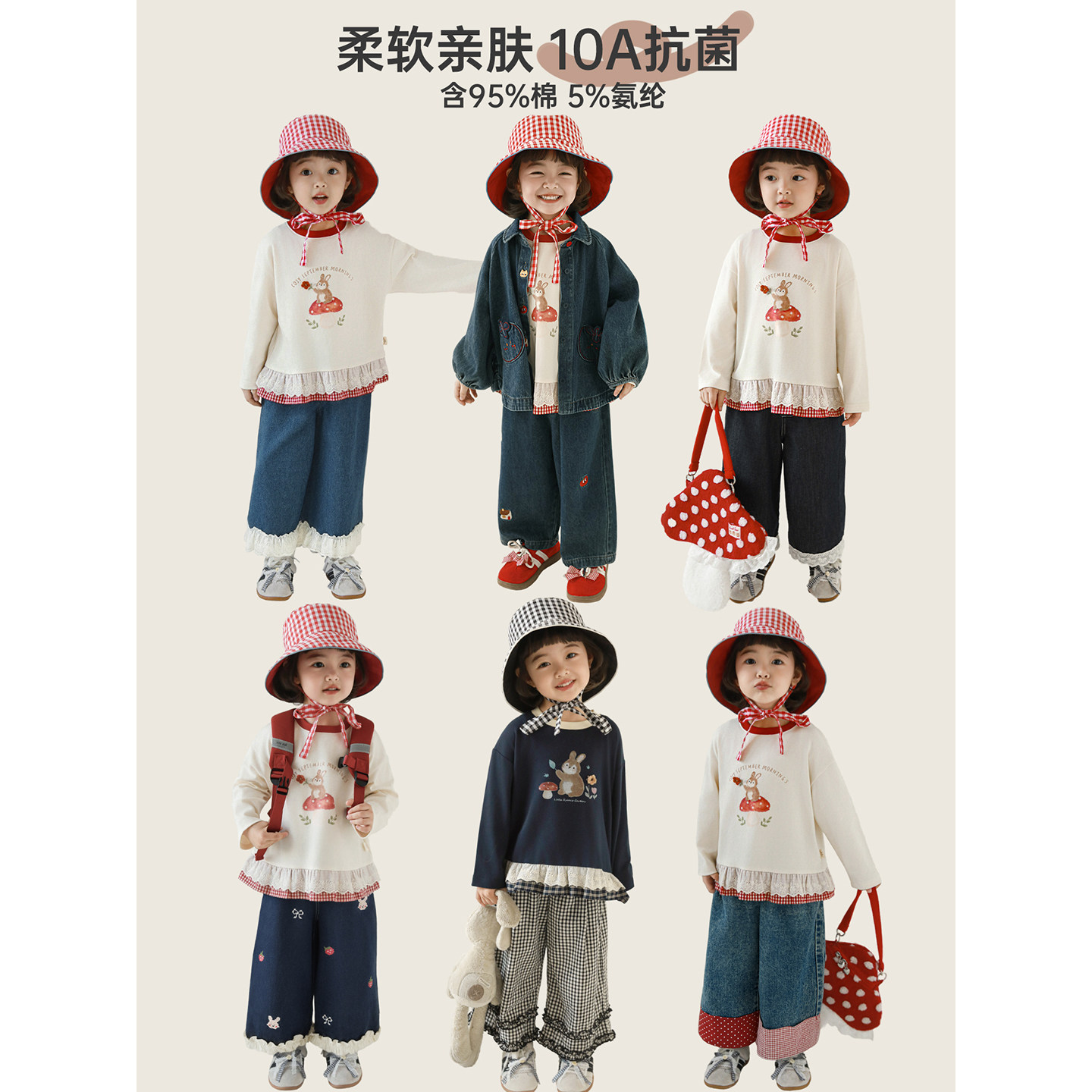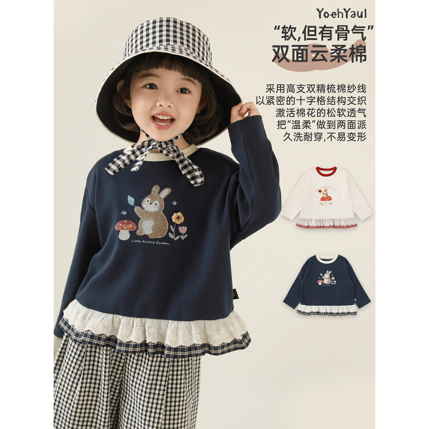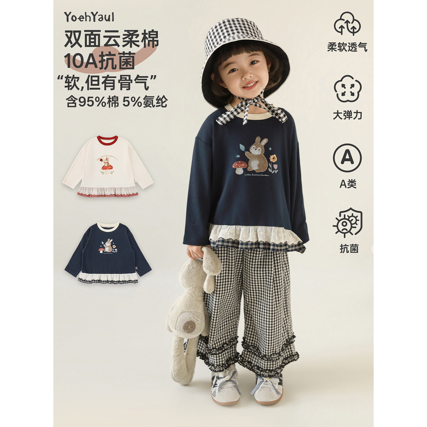 幼悠女童2026春季新款长袖卡通假两件蕾丝花边T恤抗菌休闲上衣潮