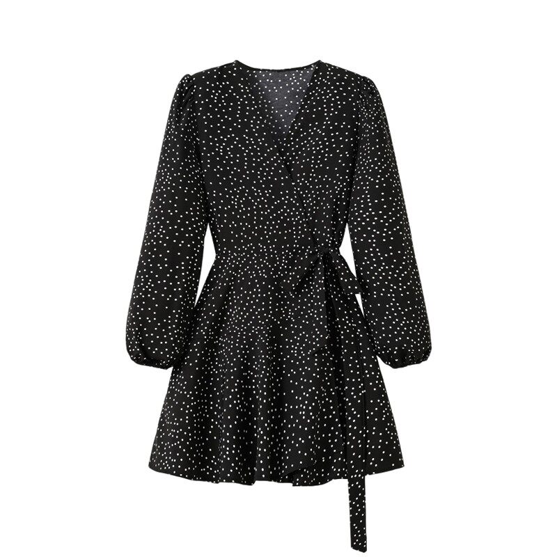 黑色波点长袖雪纺连衣裙女早秋法式V领泡泡袖气质显瘦短款A字裙子