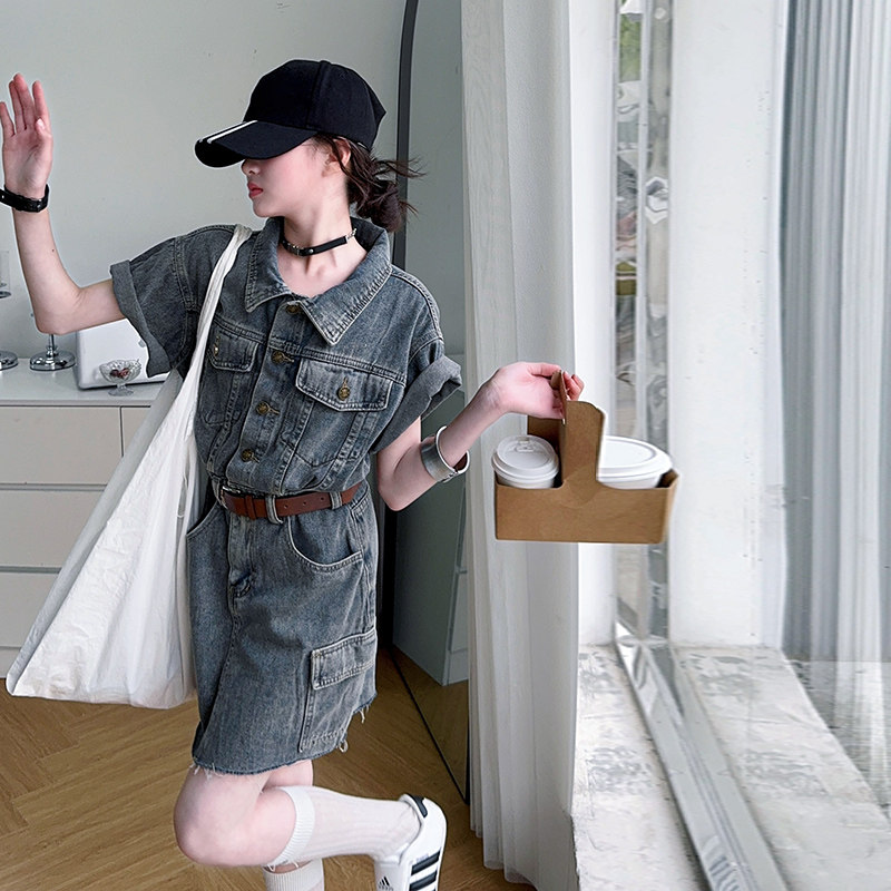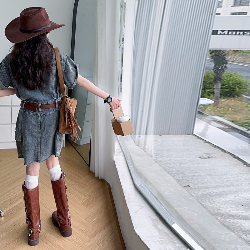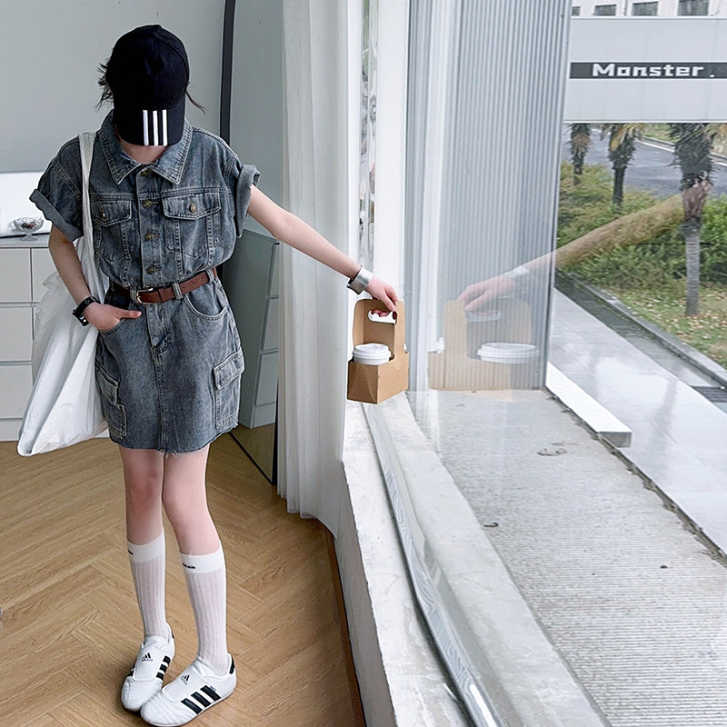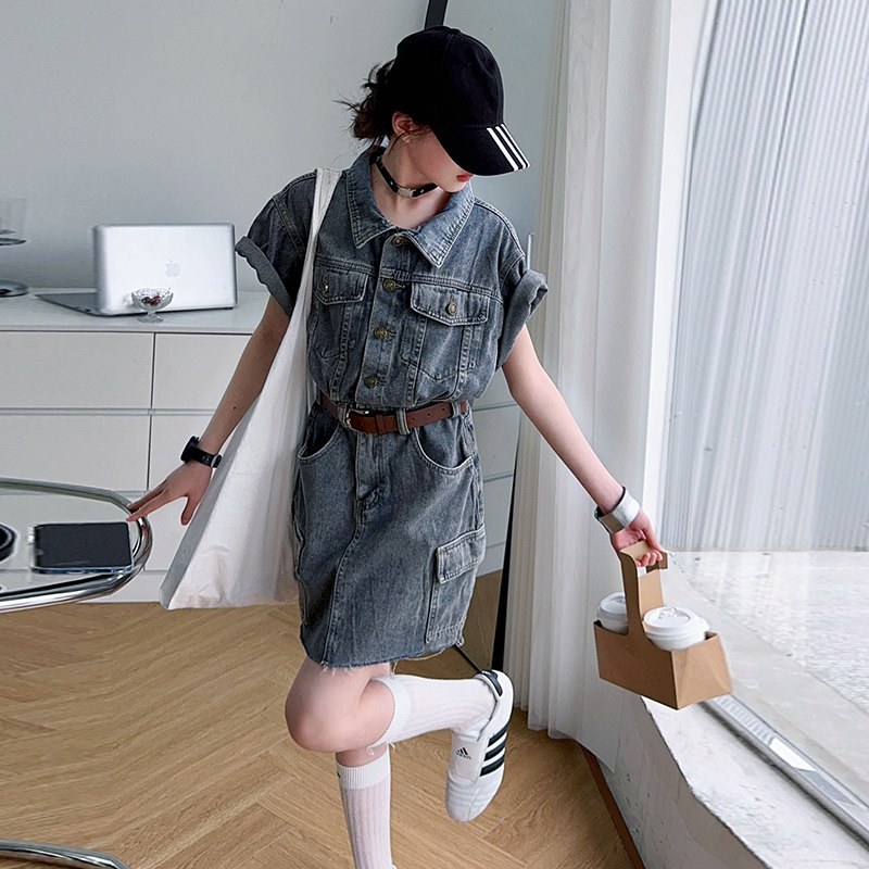 复古牛仔连衣裙女童夏季港风法式气质修身显瘦小个子收腰工装牛仔