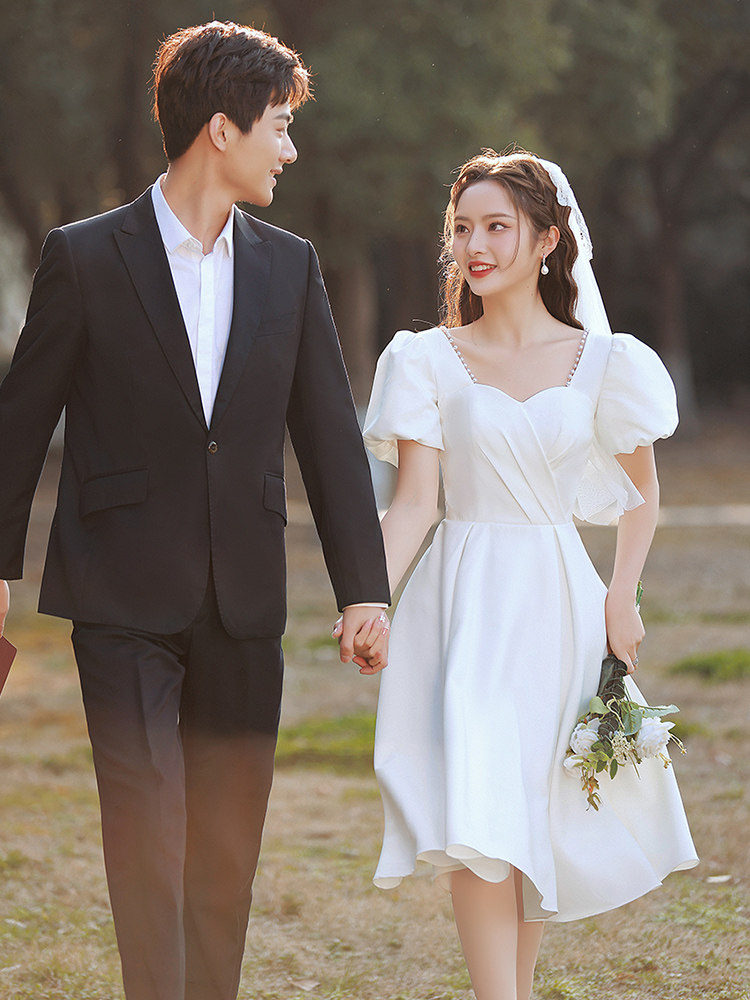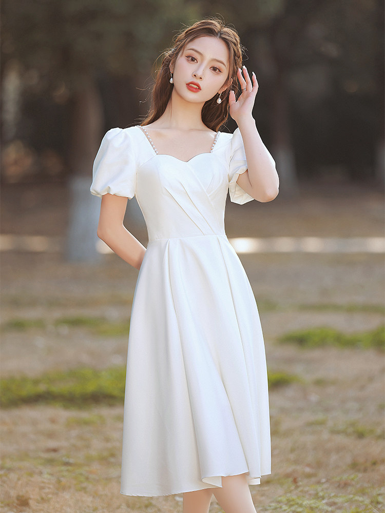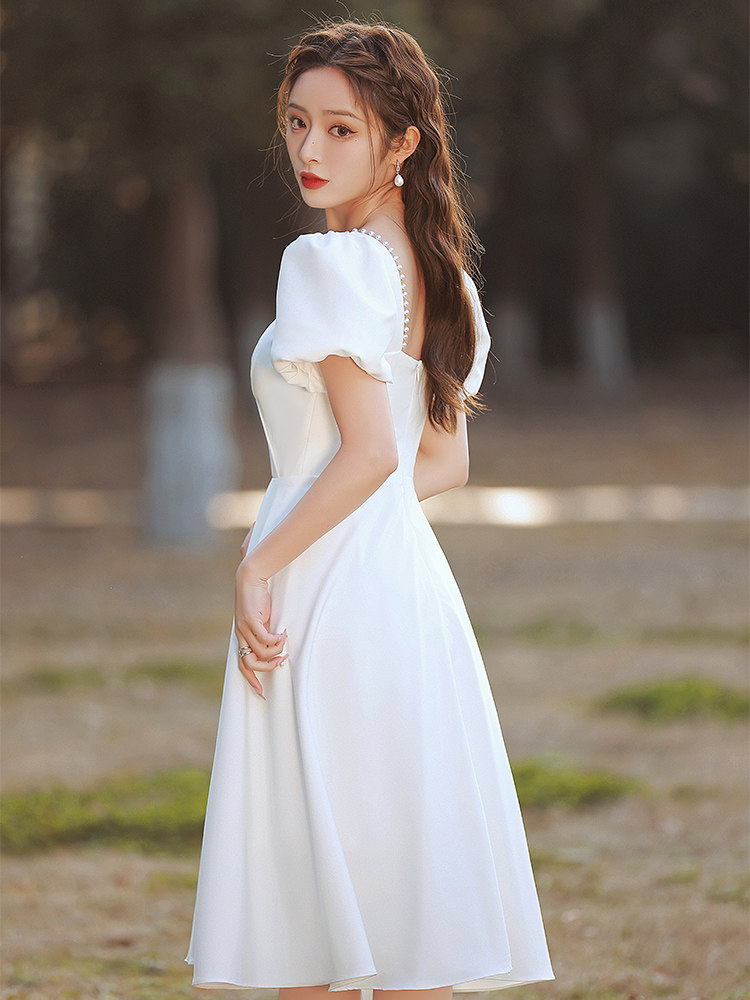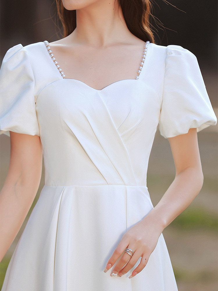 白色珍珠领订婚晚礼服女法式优雅毕业平时可穿小个子泡泡袖连衣裙