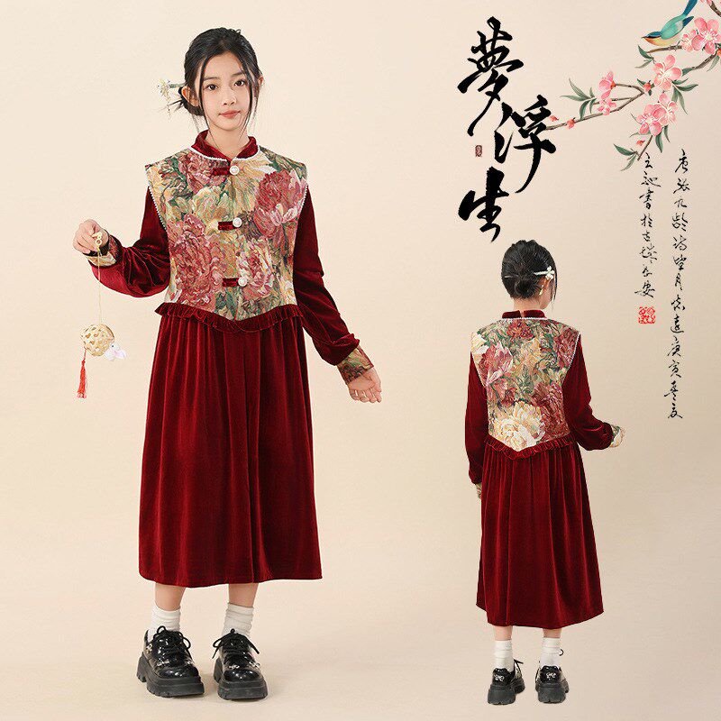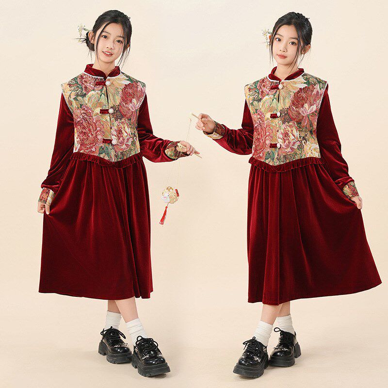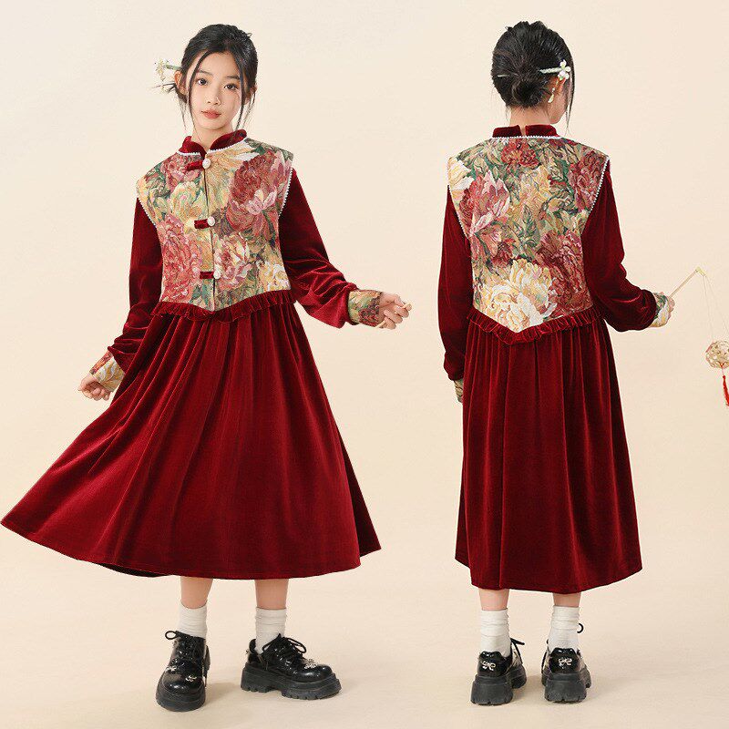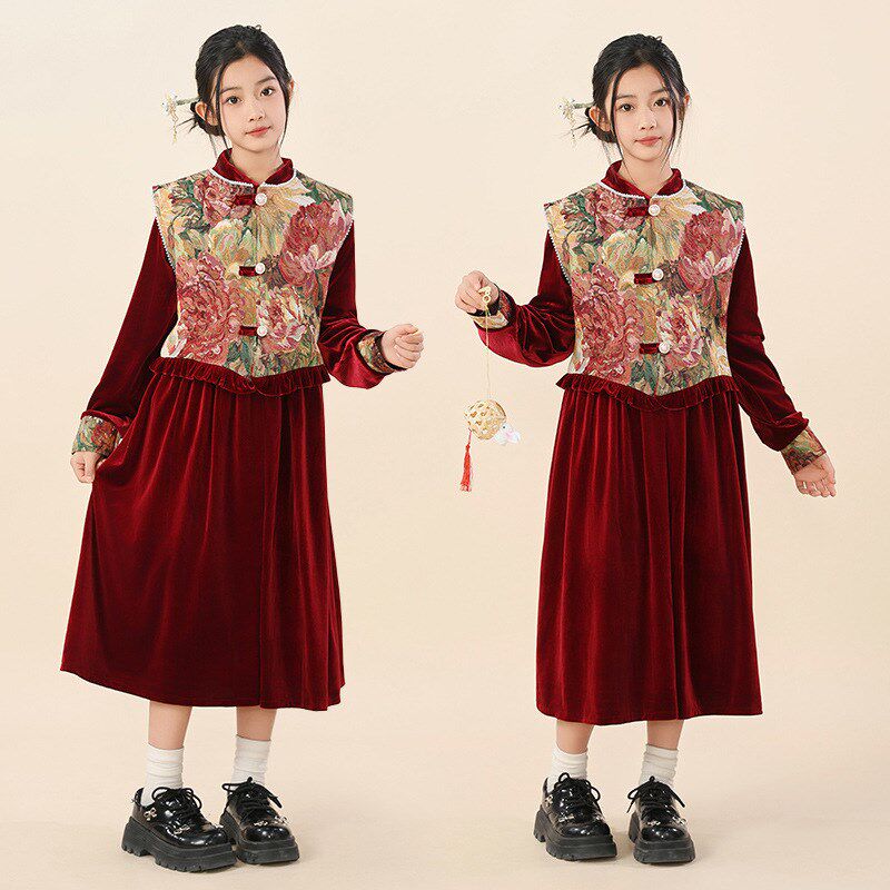 胖女童连衣裙儿童秋冬加肥加大旗袍马甲两件套拜年喜庆新中式裙子