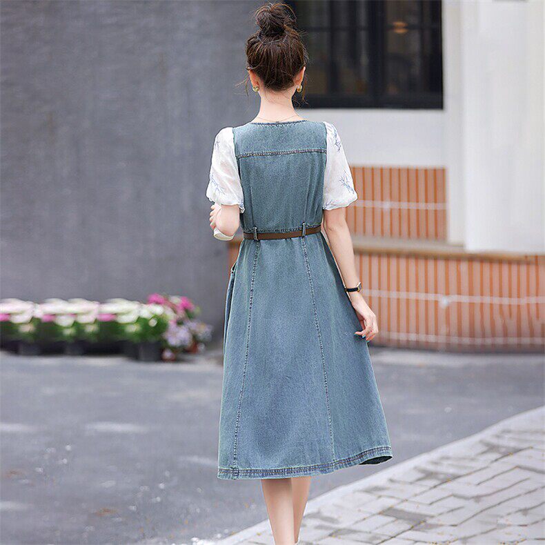 牛仔连衣裙女夏薄款方领收腰显瘦小个子拼接衬衫裙
