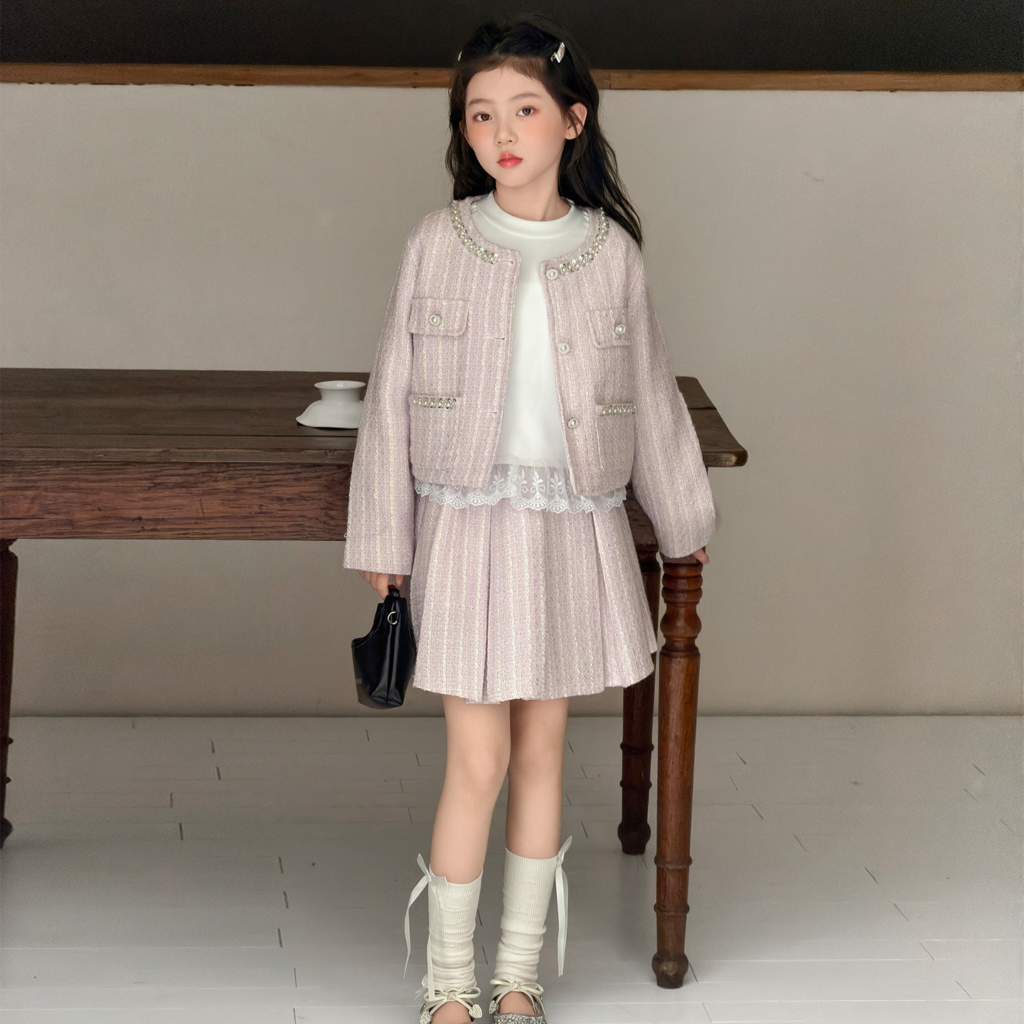 女童套装裙2026春季新款洋气中大童春装小香风外套打底裙子三件套