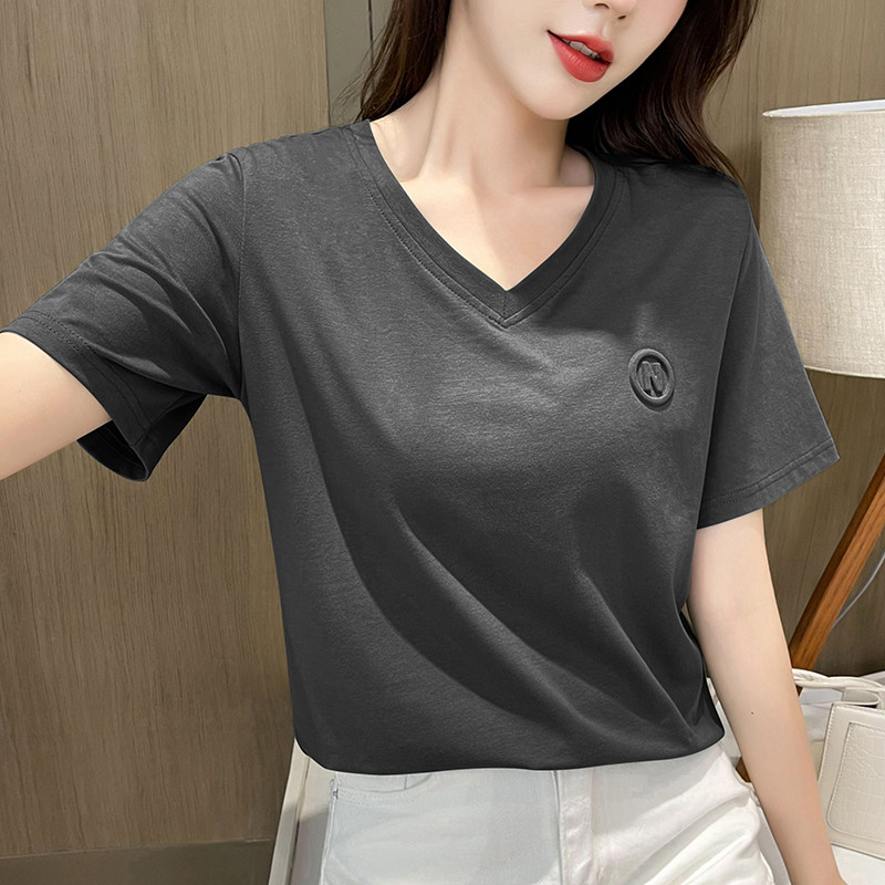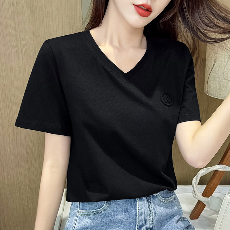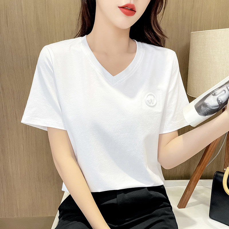 纯棉V领短袖t恤女2021年新款女装夏季宽松打底衫百搭纯色丅桖半袖