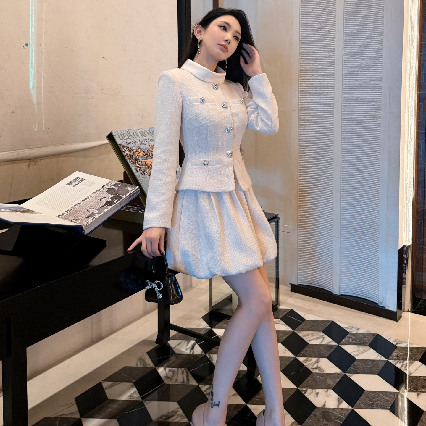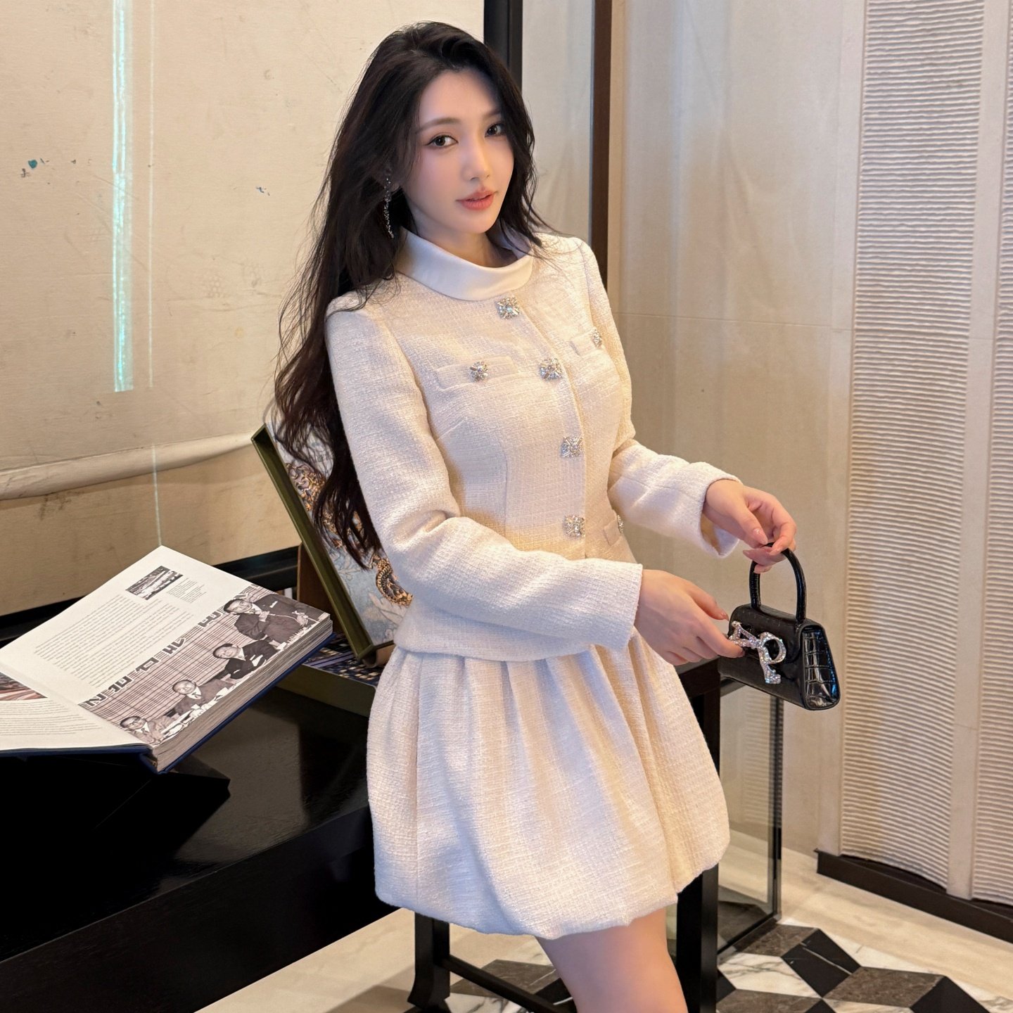 春季新款女装财阀千金法式小香风长袖立领米白色连衣裙假两件洋装