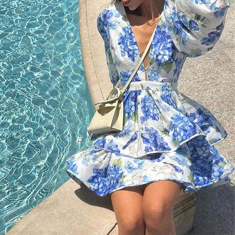 欧美大码V领泡泡长袖印花荷叶边短款连衣裙 Deep V floral dress