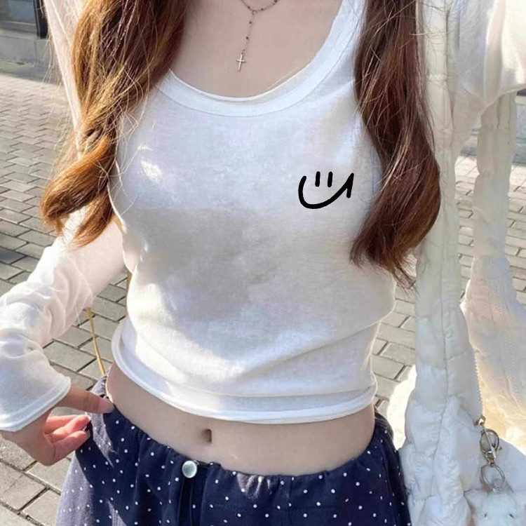 美式辣妹修身收腰短款小上衣女款春季内搭打底u领正肩白色长袖T恤