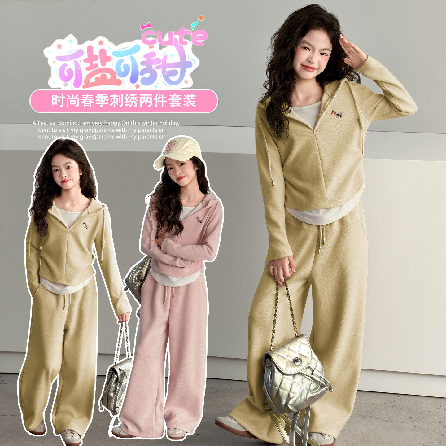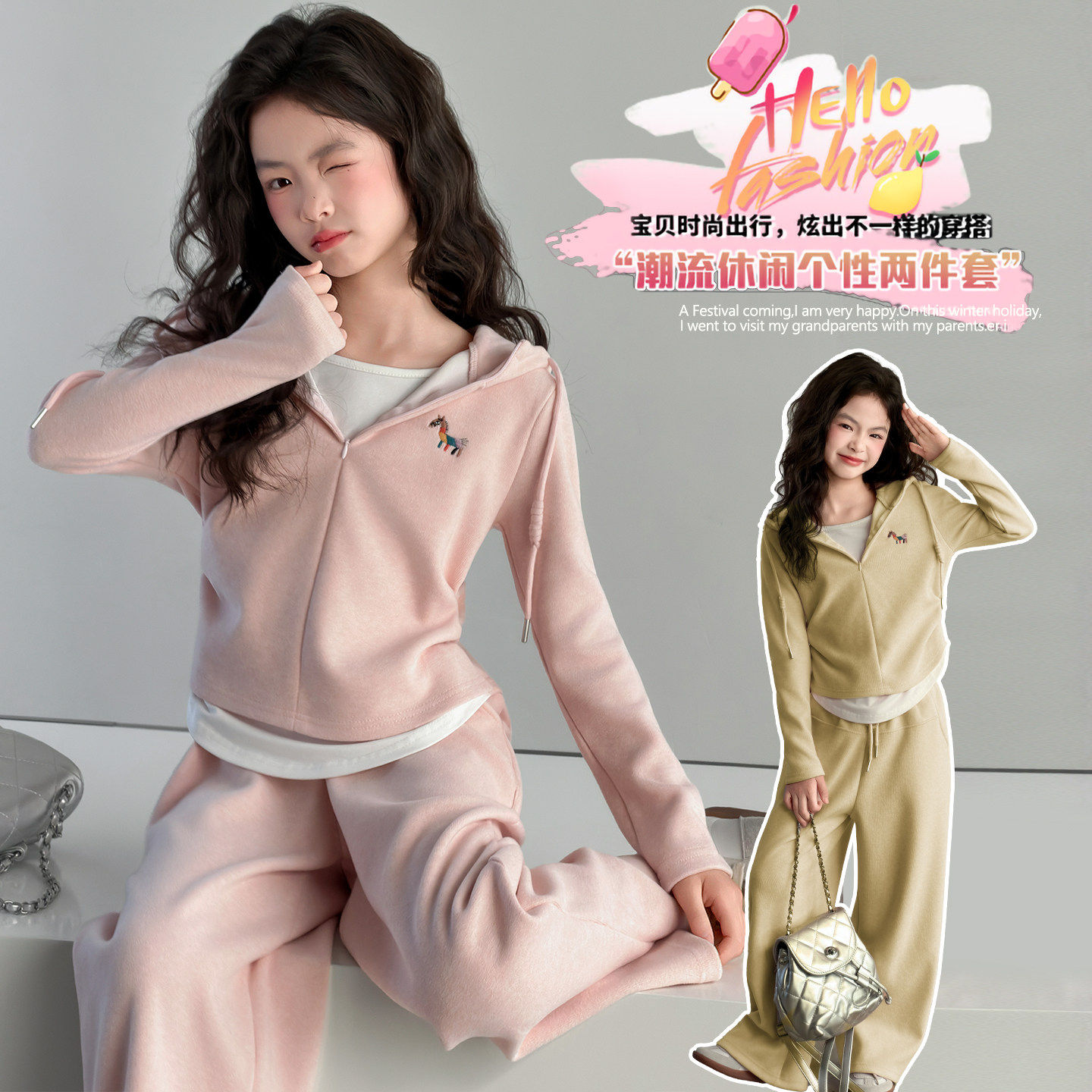 2026春装儿童套装阔腿裤两件长袖连帽韩系运动套装新款运动衫女童