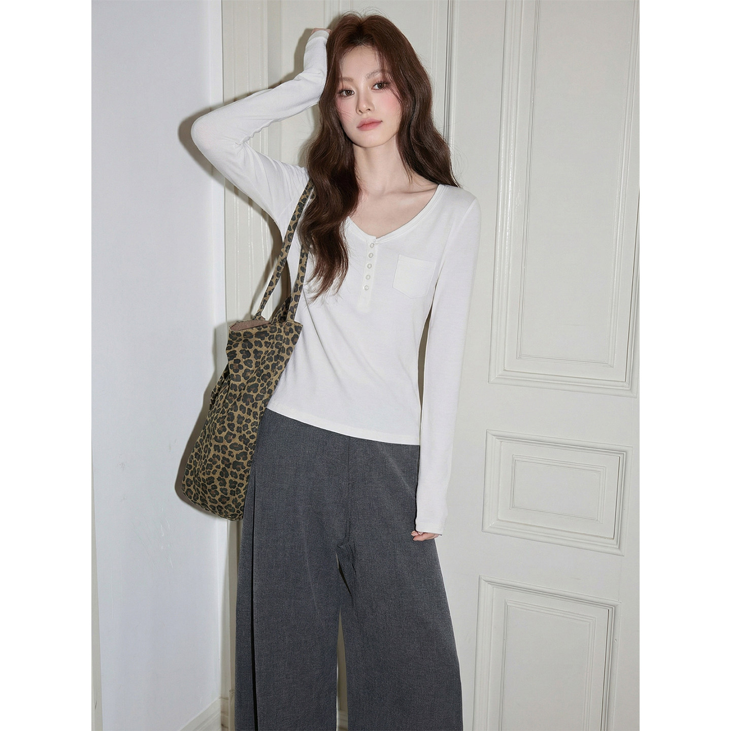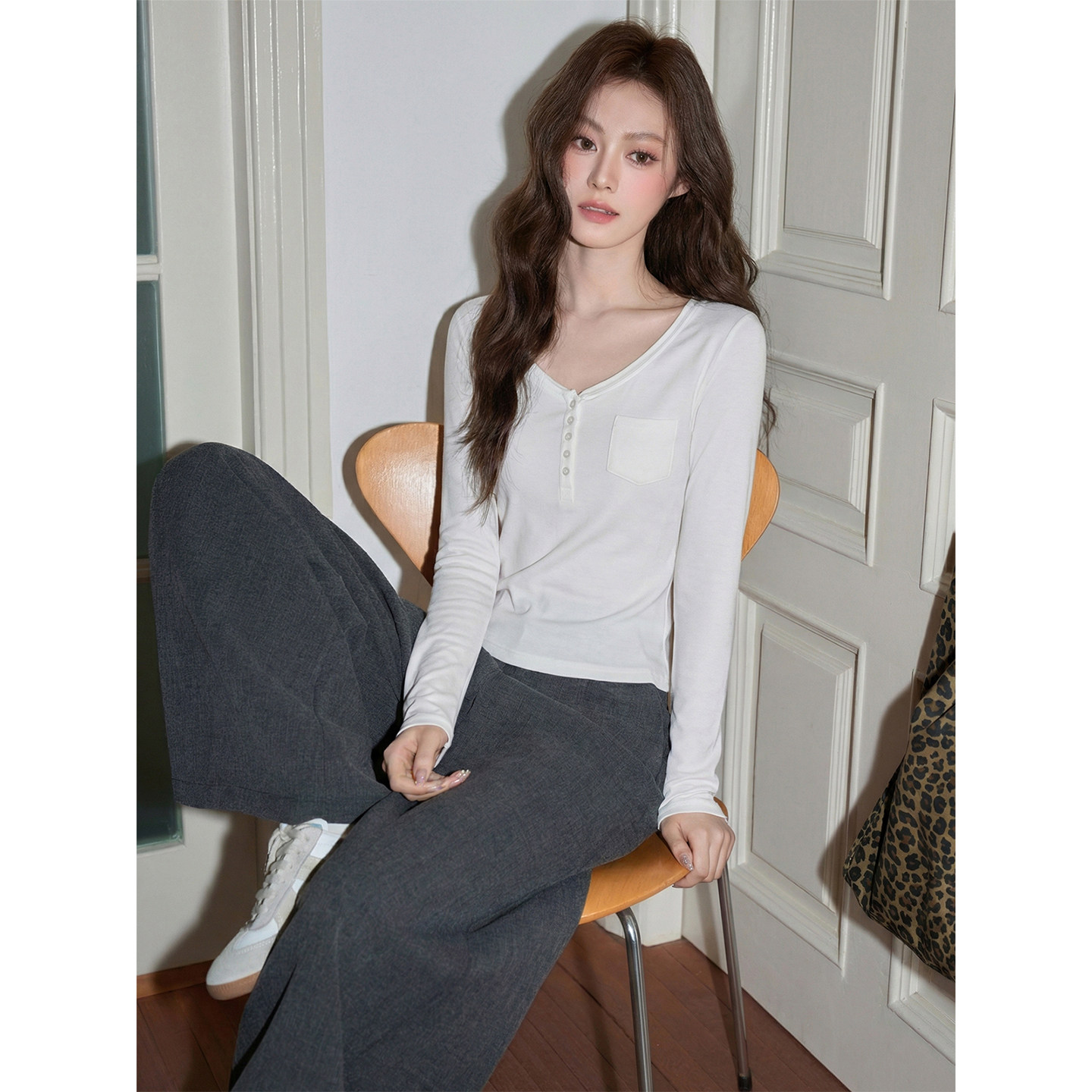 韩系高级感v领打底上衣女装2026早春新款修身掐腰纯欲白色长袖T恤