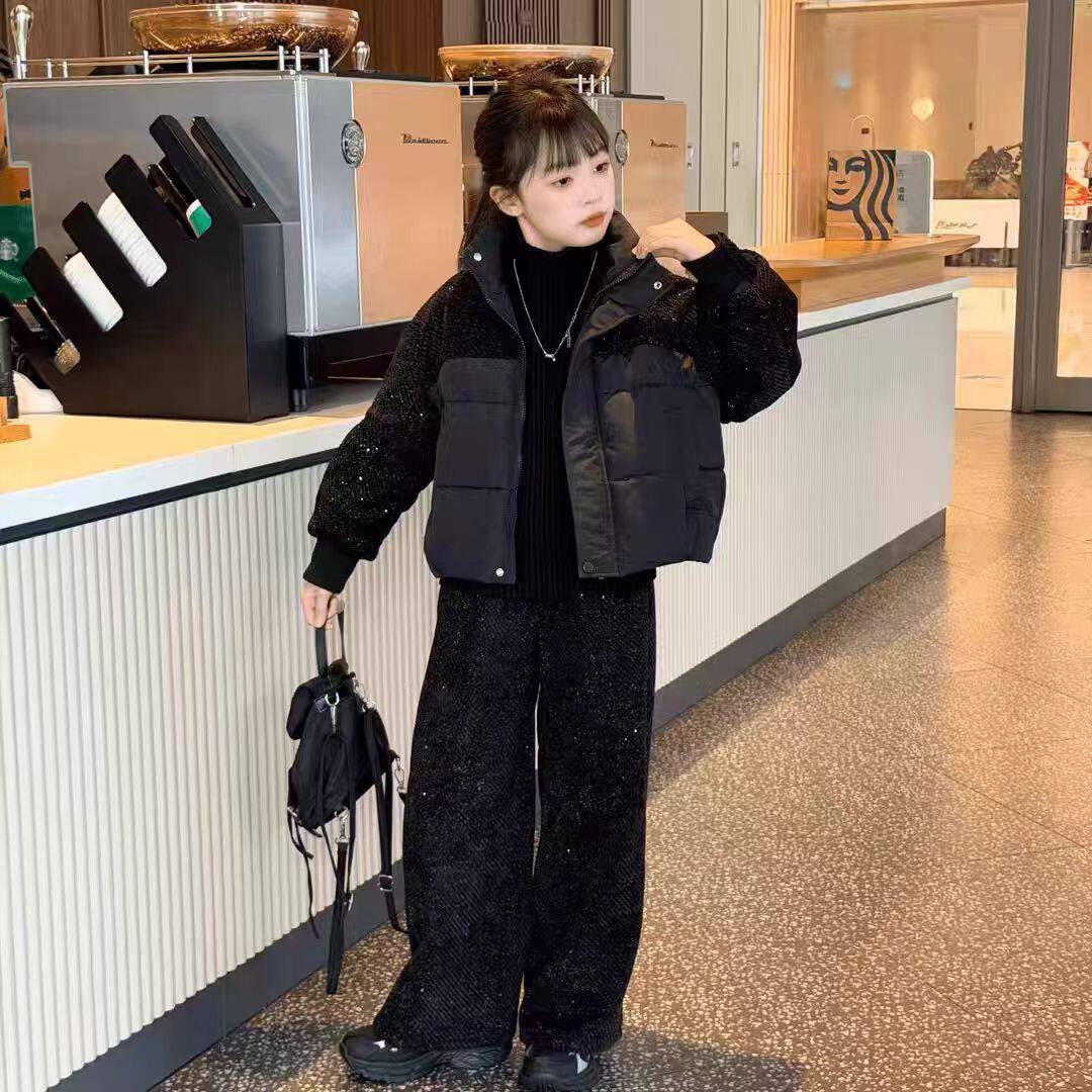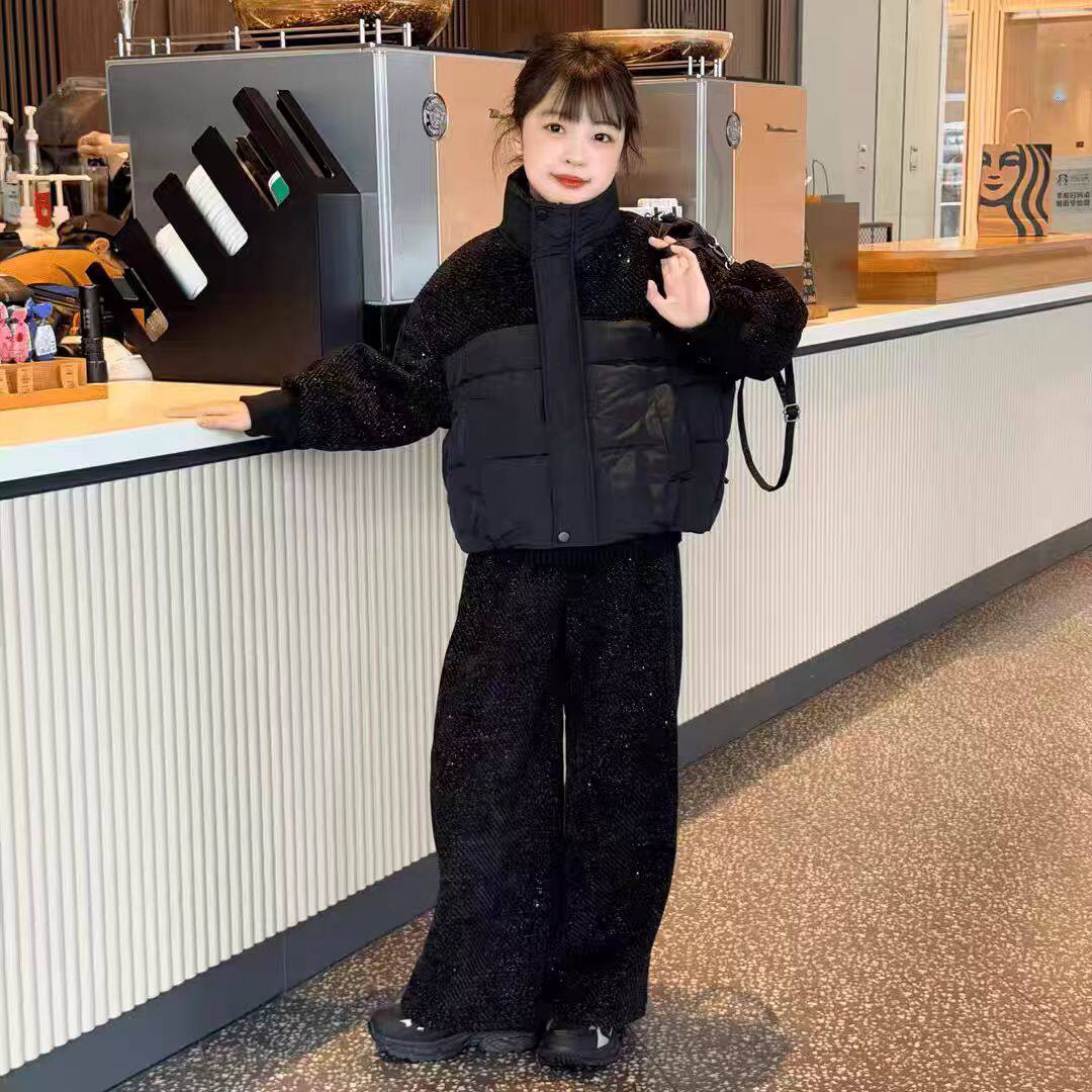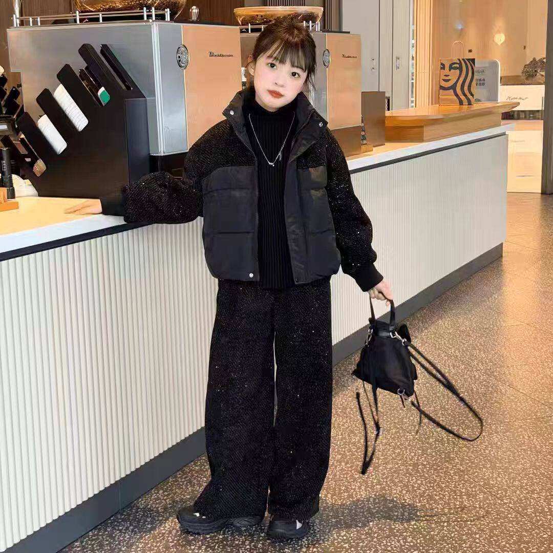 女童满天星棉衣套装2025秋冬新款中大童潮酷棉服外套闪亮阔腿裤潮