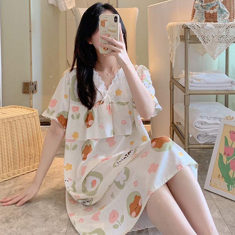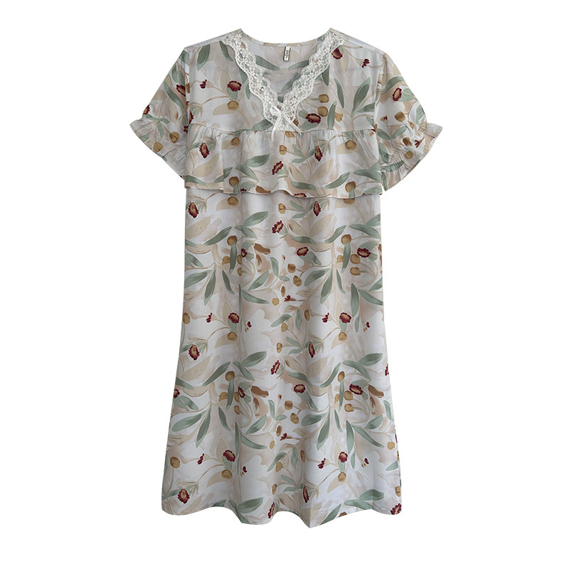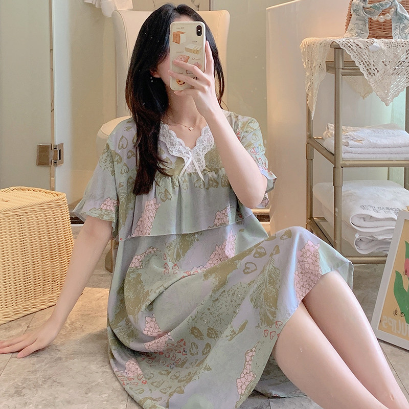 棉绸睡裙夏季薄款防凸点短袖连衣裙可爱人造棉睡衣大码外穿家居服