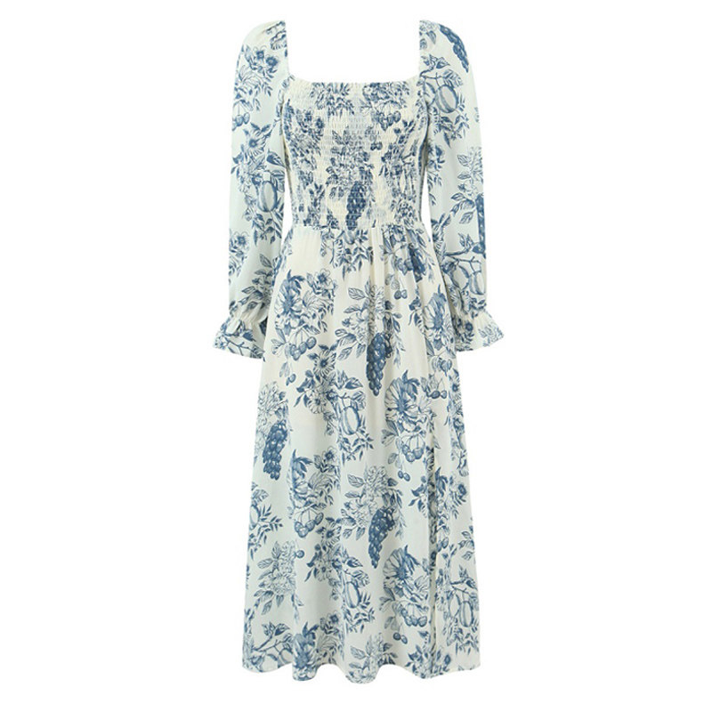 【包邮】欧美风新款气质方领印花连衣裙长袖收腰修身显瘦开叉长裙