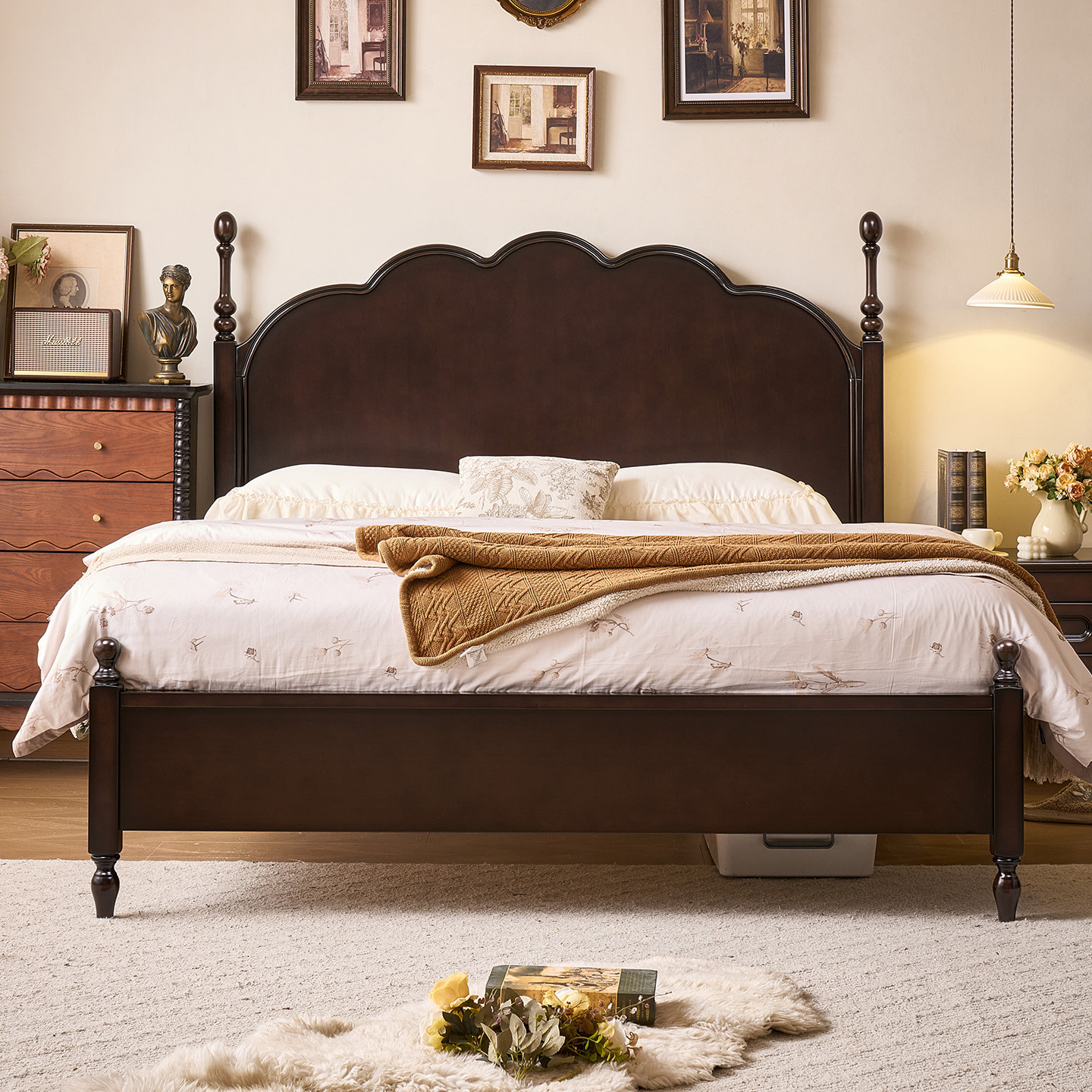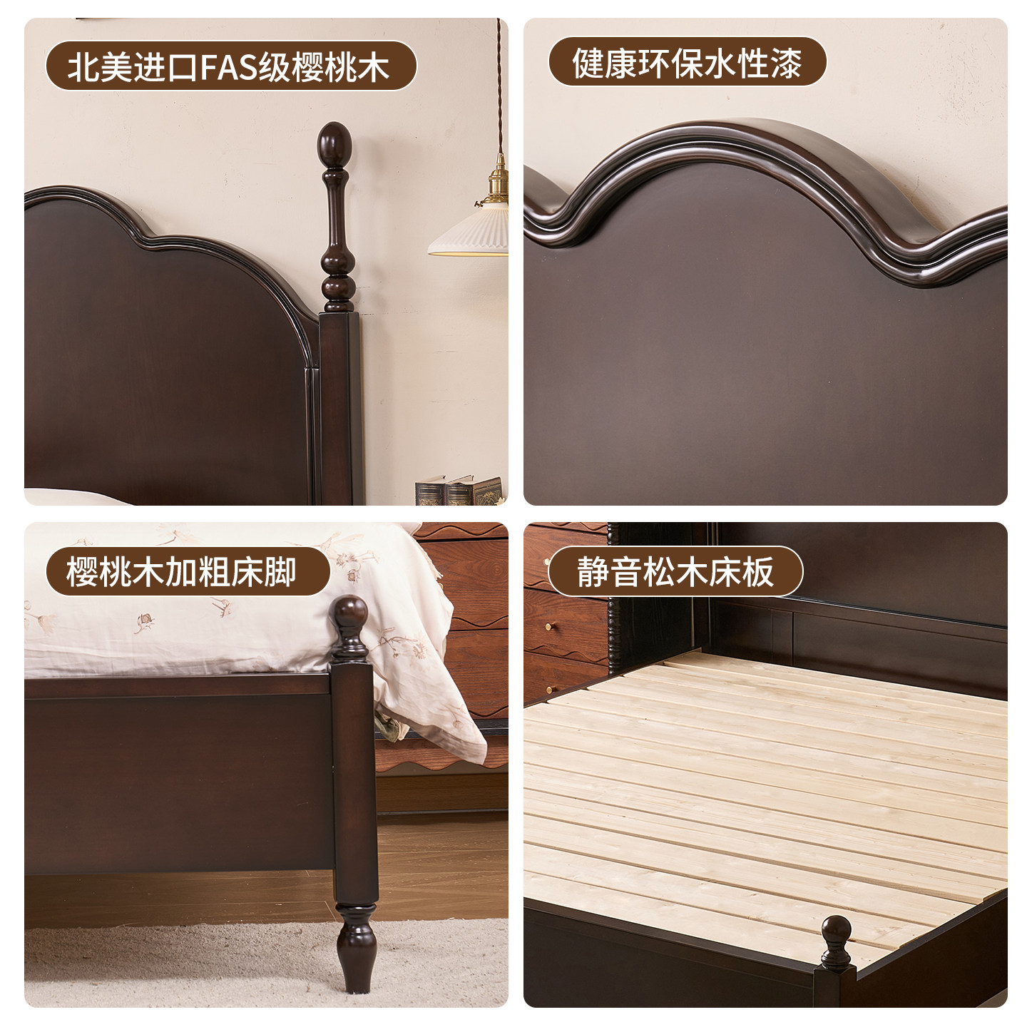 法式复古樱桃木实木床中古风主卧1.8米单双人床美式2米轻奢婚床