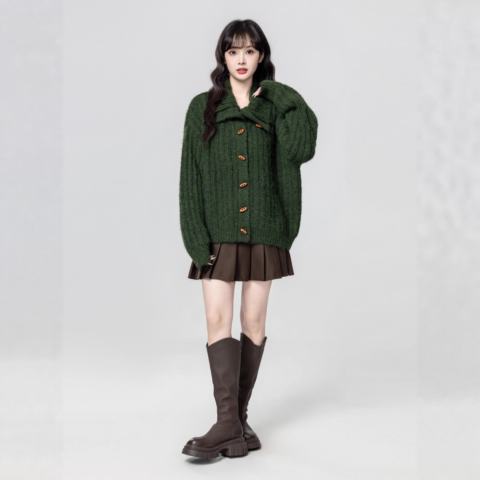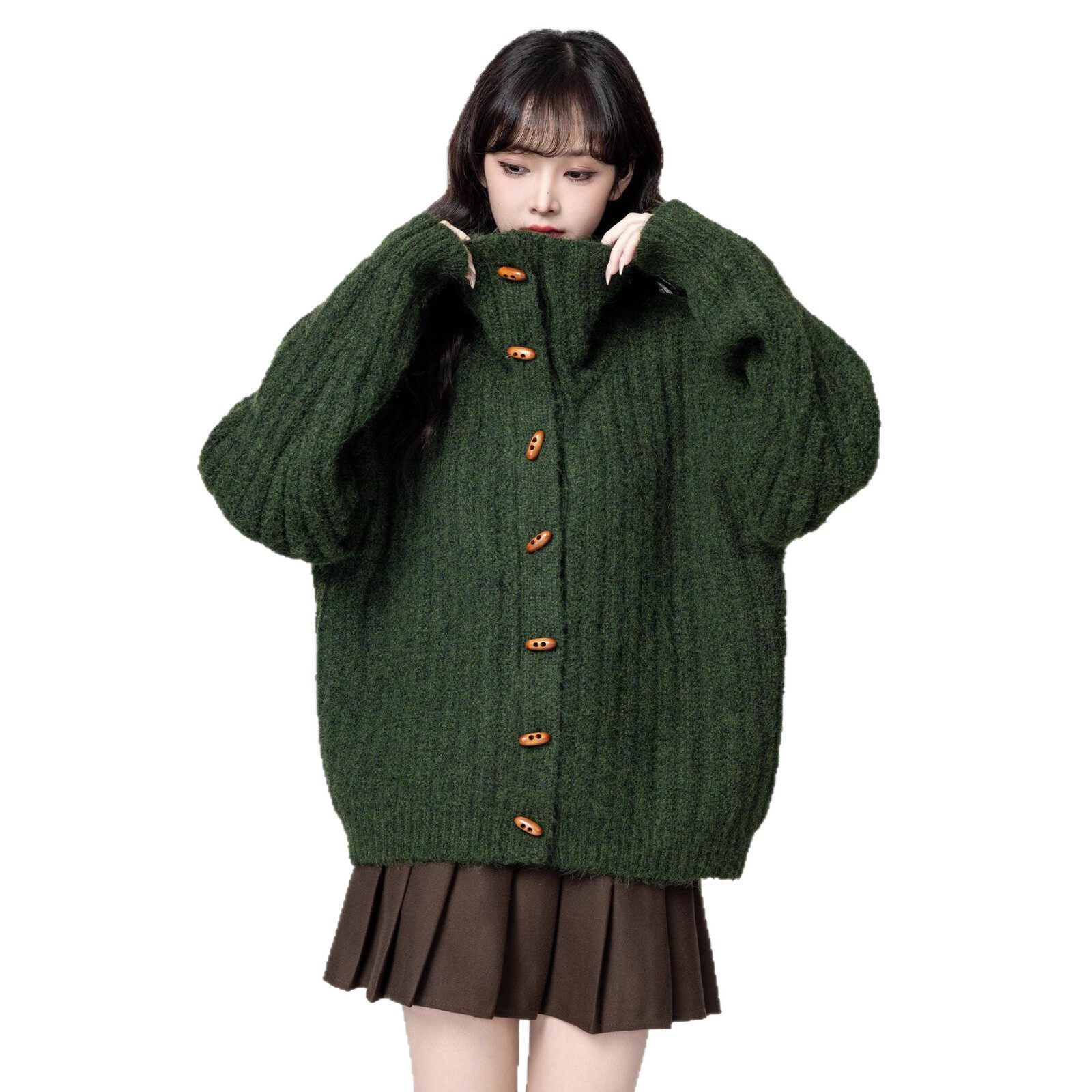 绿色高领毛衣外套女款秋冬2026冬季新款保暖加厚立领针织开衫上衣