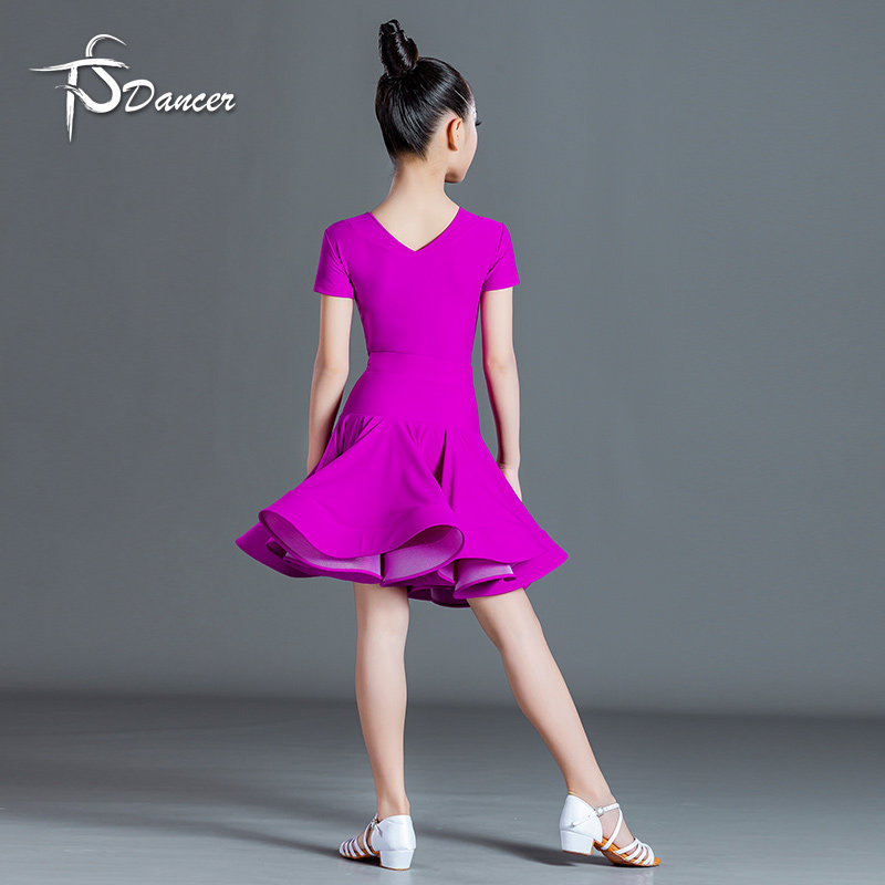 新款拉丁舞比赛服儿童女练功服短袖V领专业考级服大摆国标规定服
