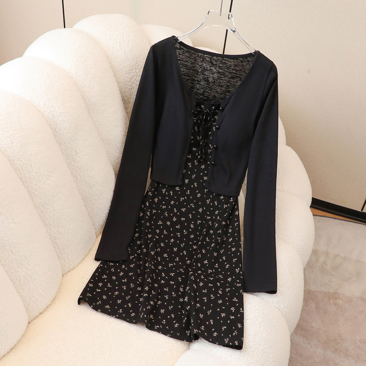 拉夏贝尔夏季新款女装黑色碎花吊带连衣裙+外披宽松显瘦气质长裙